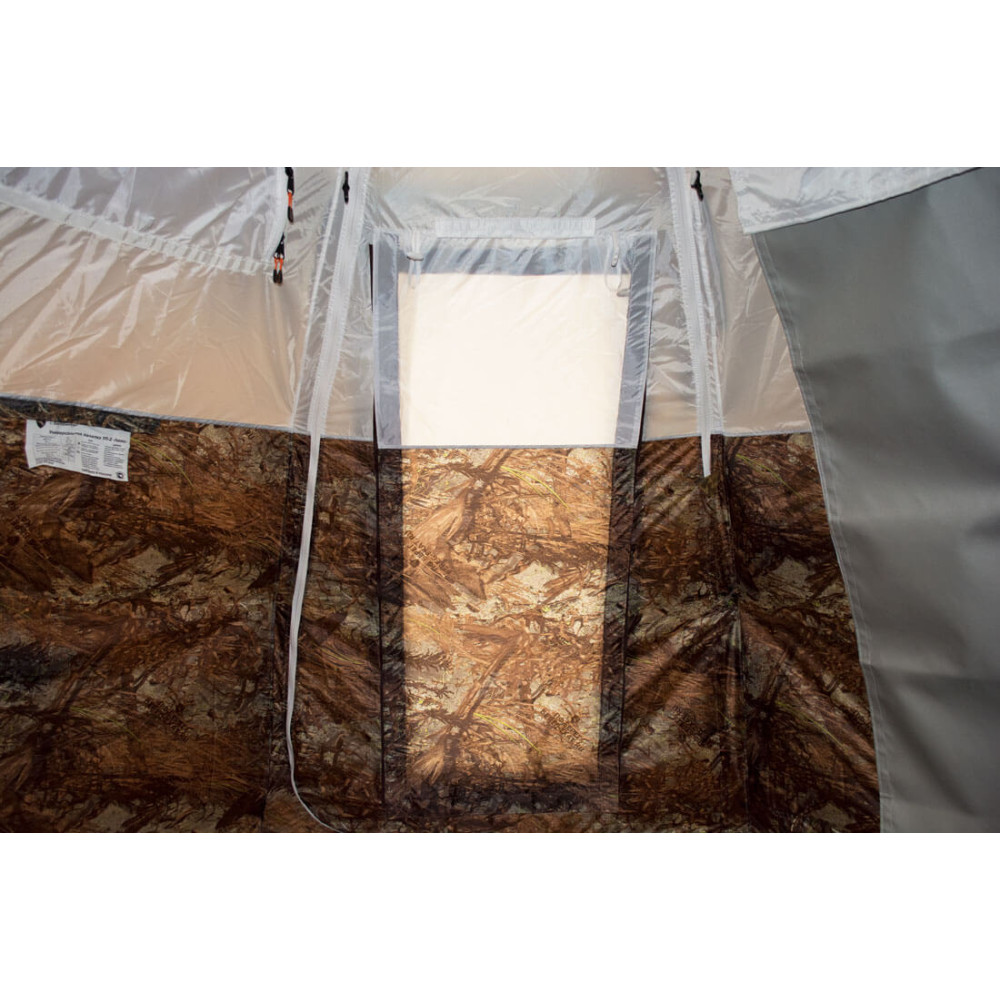 Смотровые многофункциональные окна состоят из пяти слоев: защитный клапан на липе, наружний слой на молнии, прозрачное оконное заполнение из морозостойкой силиконовой пленки на липе, антимоскитная сетка на молнии, внутренний тент на молнии. Со стороны наружного слоя можно установить специальную подпорку - так будет происходить вентилирование помещения без попадания внутрь палатки нежелательных осадков.
