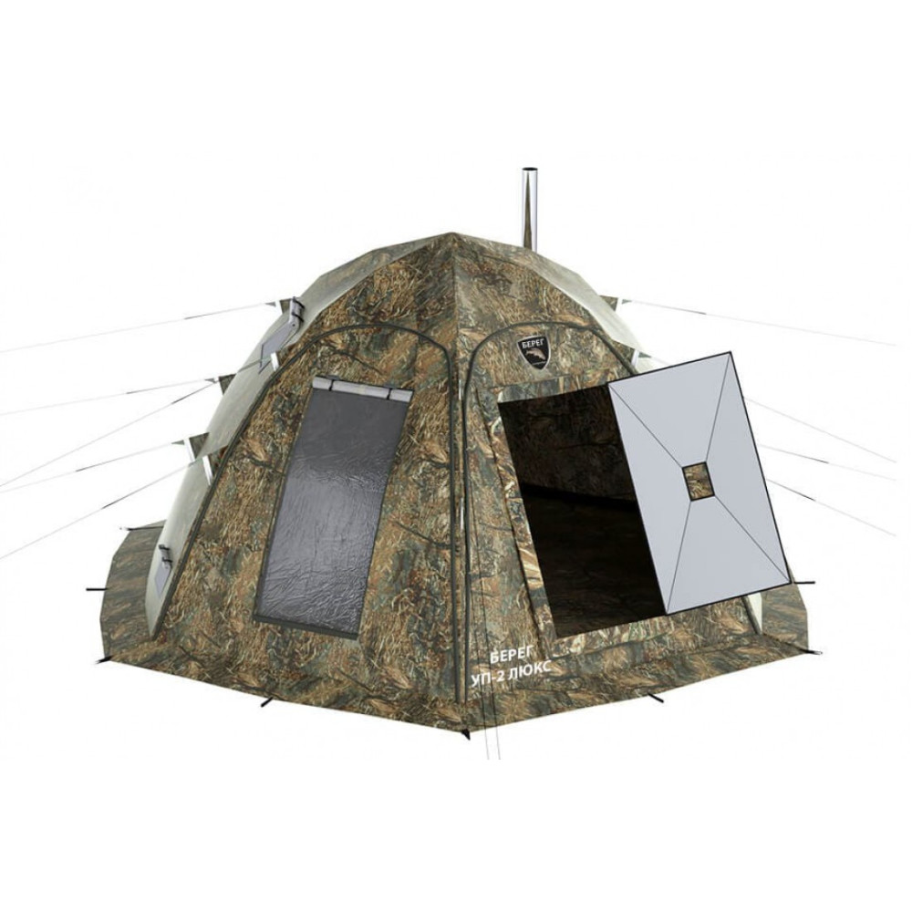 УП-2 «Люкс» - жилой модуль, походная баня, рыболовная палатка, полноценный летний шатер! Четыре просторных арочных входа продублированы антимоскитными сетками на молниях, обеспечивая лучшую продуваемость в жаркую погоду, а также отличный обзор.