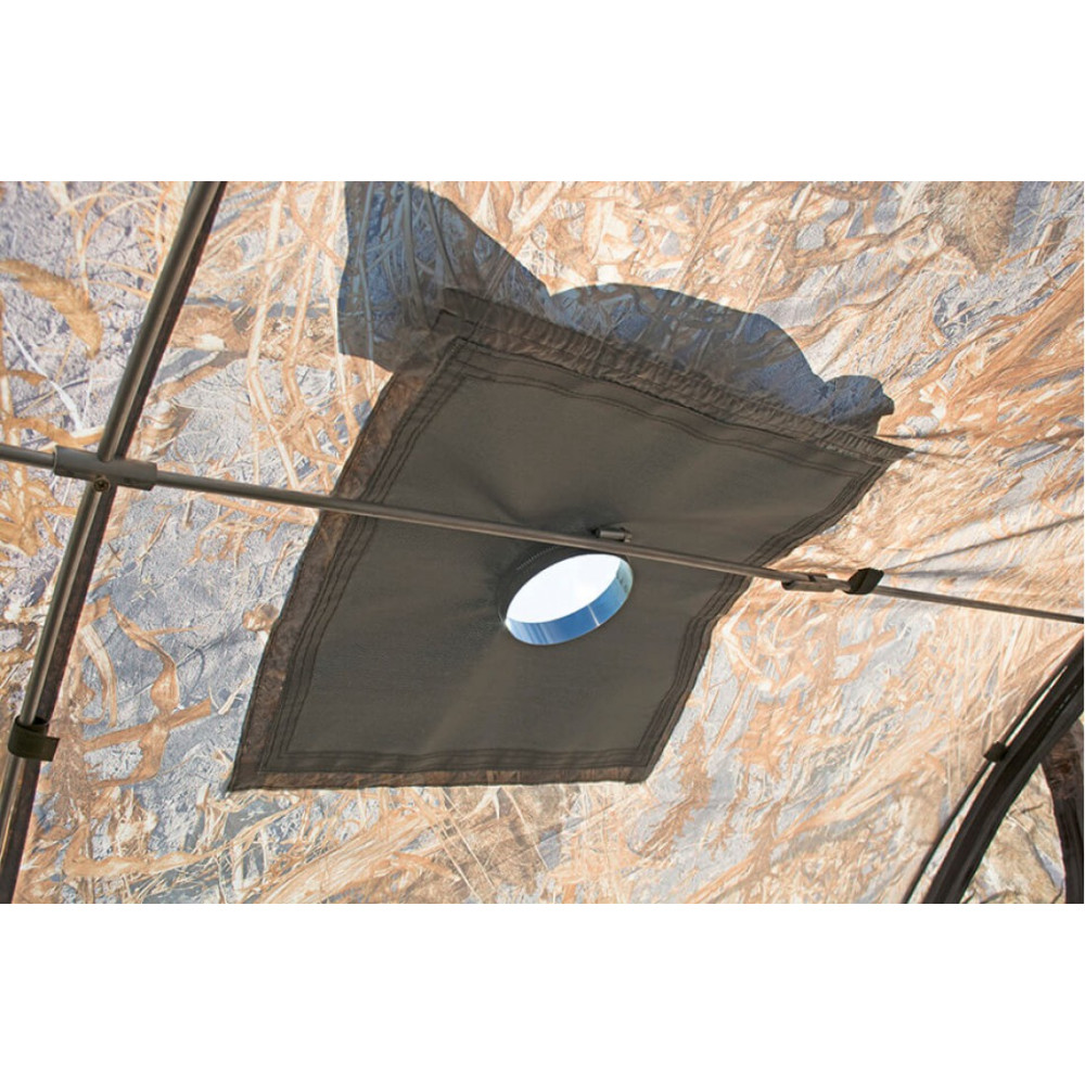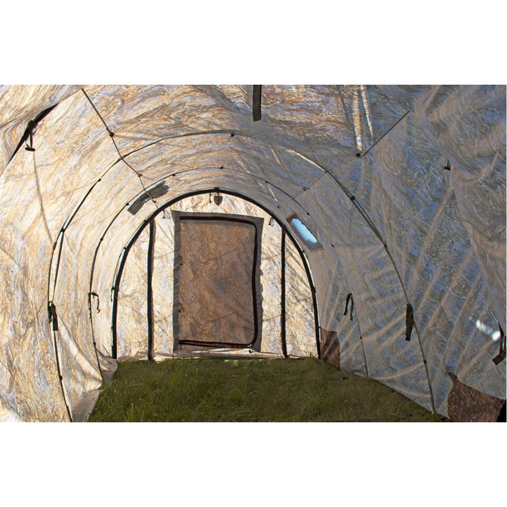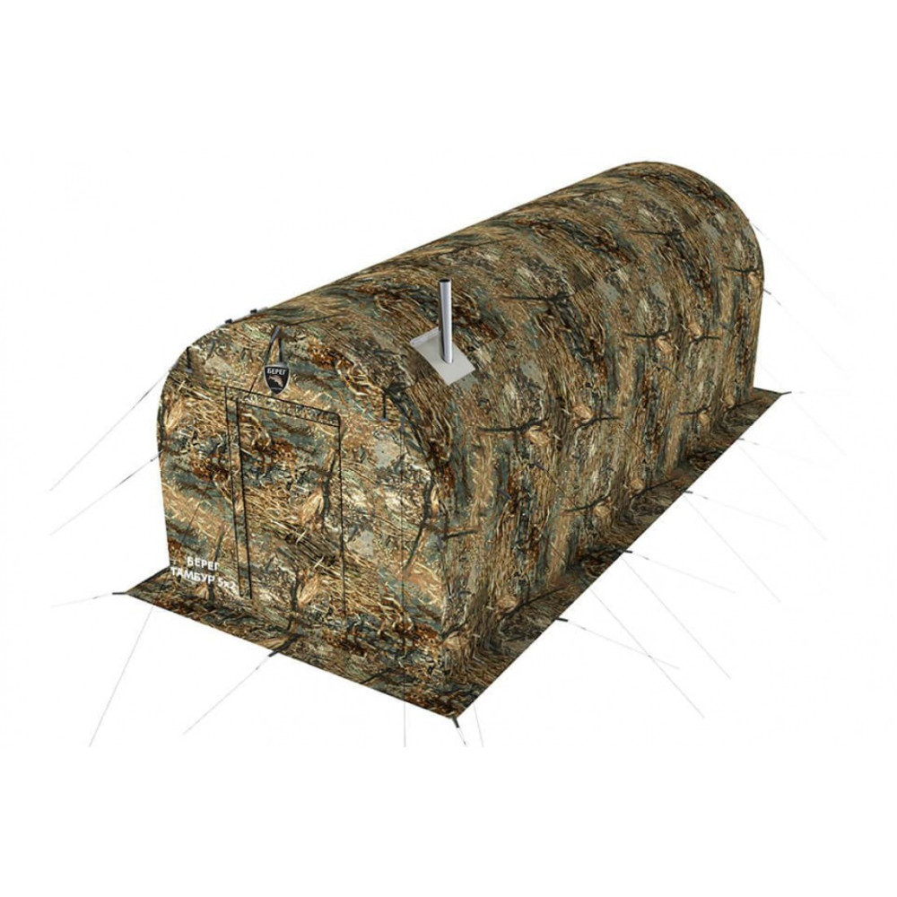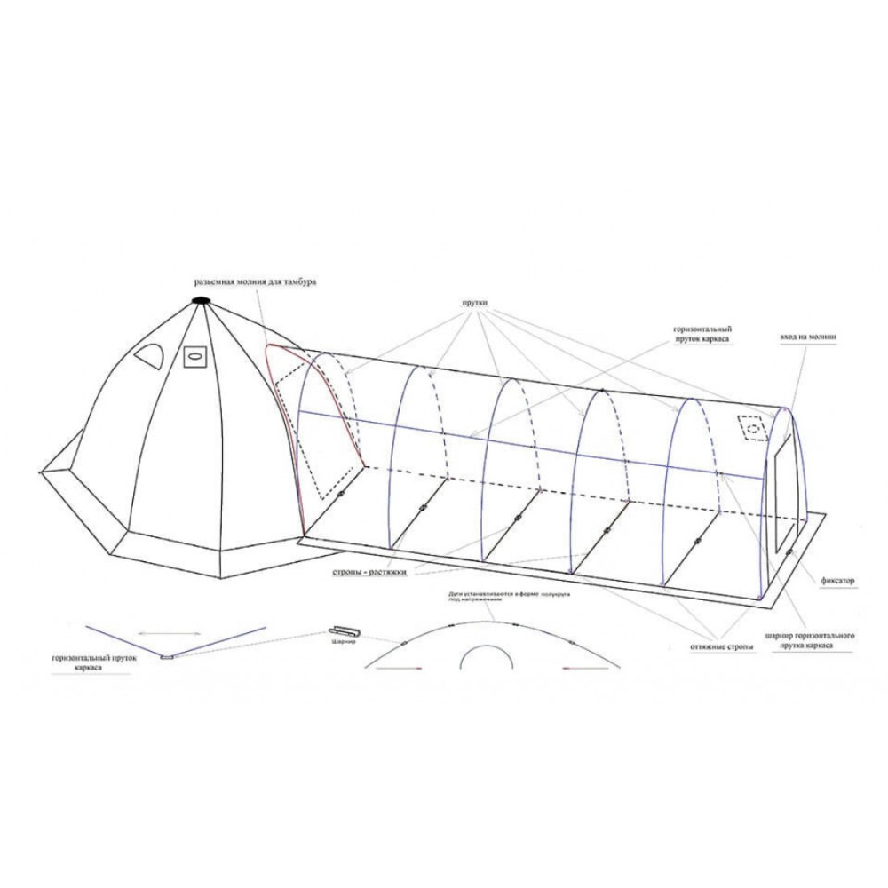 Тамбур-баня на алюминиевом каркасе с разделкой дымохода, двумя входами на молнии, окнами с москитными сетками и козырьком на молнии для крепления к палаткам серии УП.