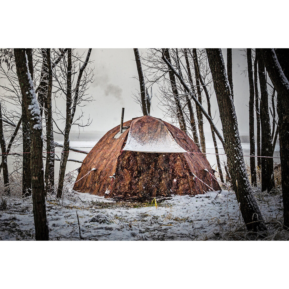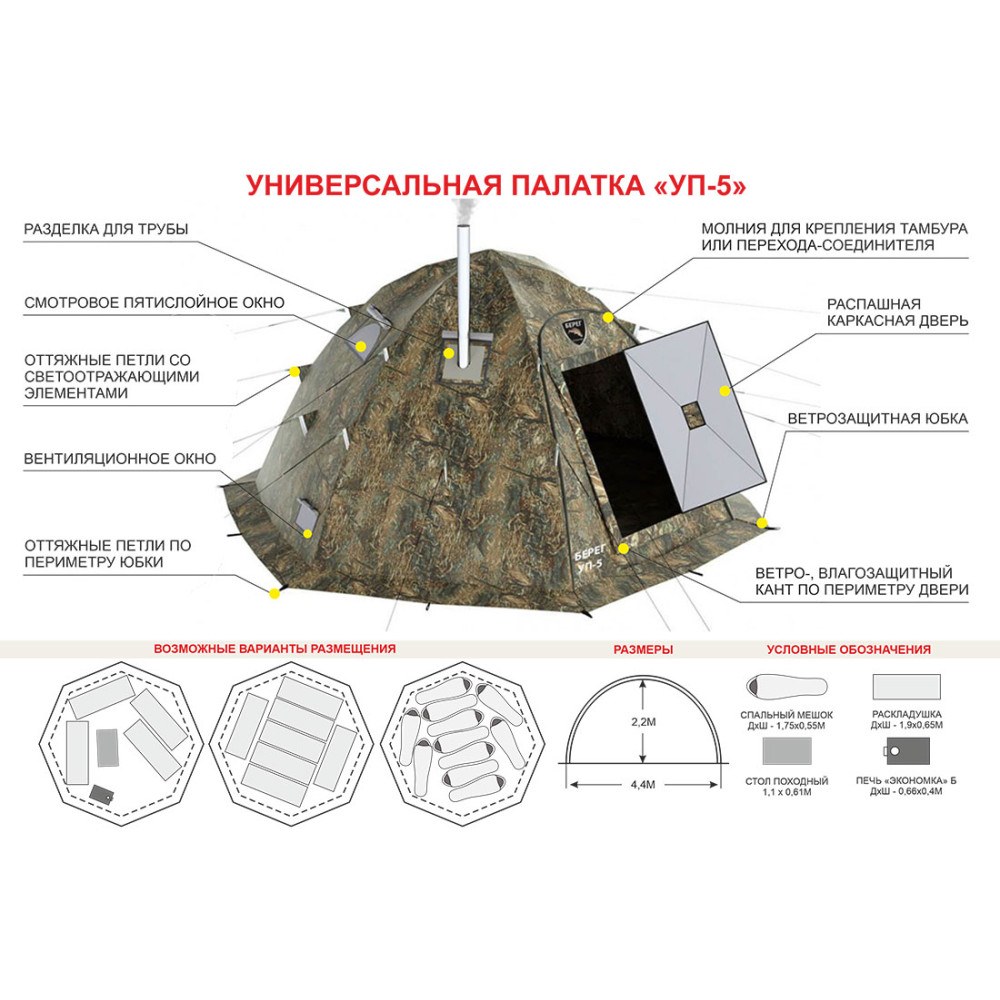 В зимней палатке Берег УП-5 рекомендовано применение утепленного дна, арктической накидки (для температур ниже -25 градусов) и походных печей Берег.