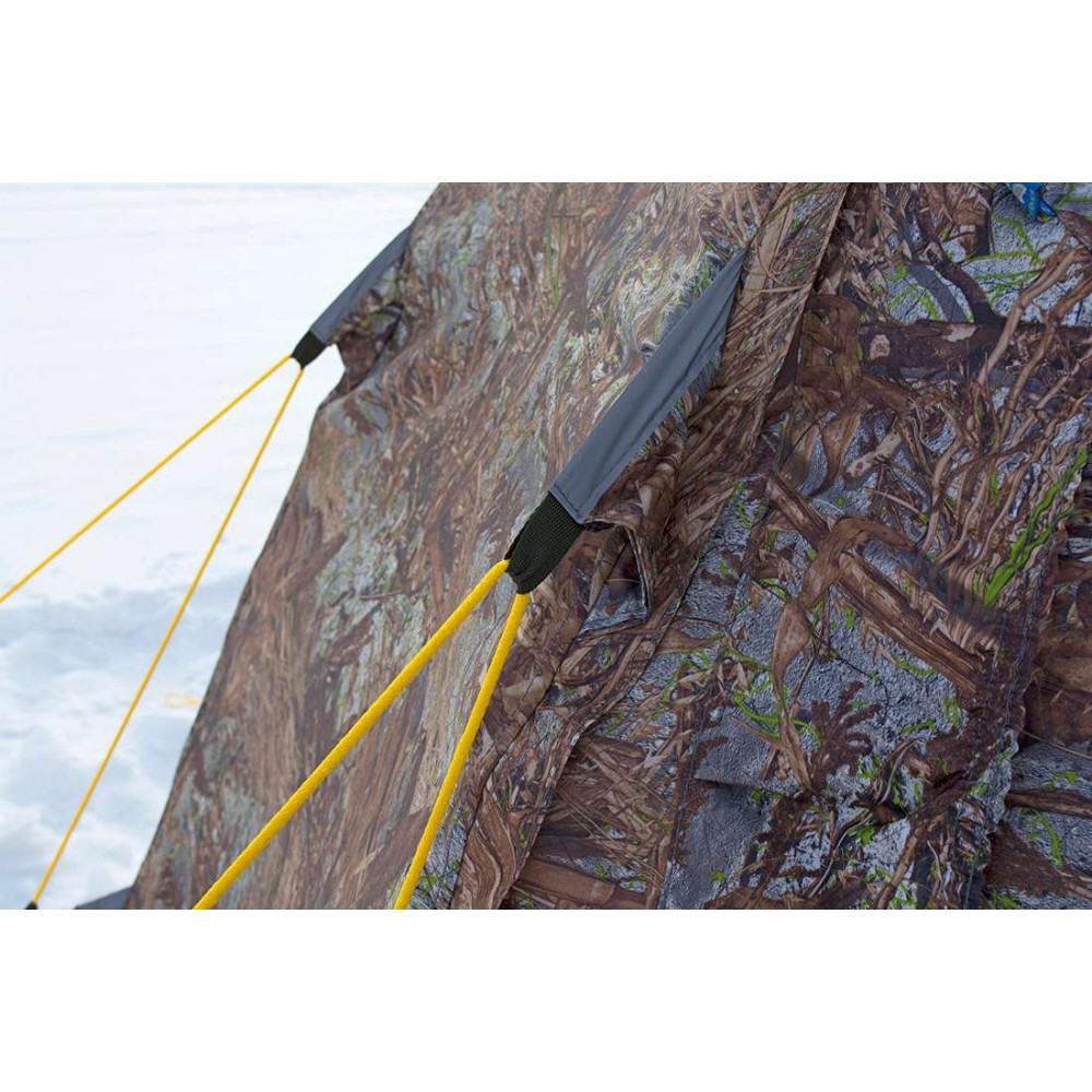 Внешний тент соединен с каркасом надежными липами из морозостойкого ПВХ. Такие липы имеют достаточно широкий размер, находятся в местах сгибов, предотвращая складывание дуг, а также защищая палатку от механических повреждений.