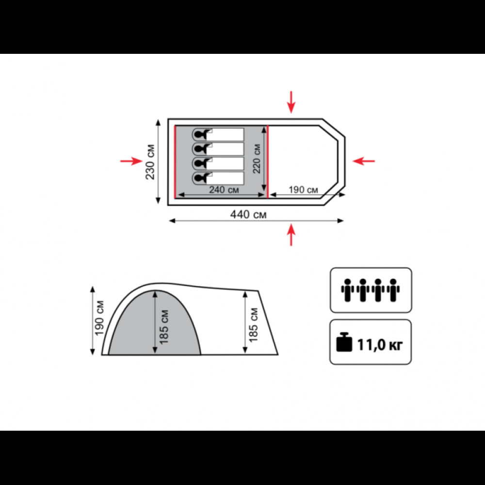 - Двухслойная кемпинговая палатка с четырьмя входами, большим фойе - Входы спального отделения продублированы москитной сеткой