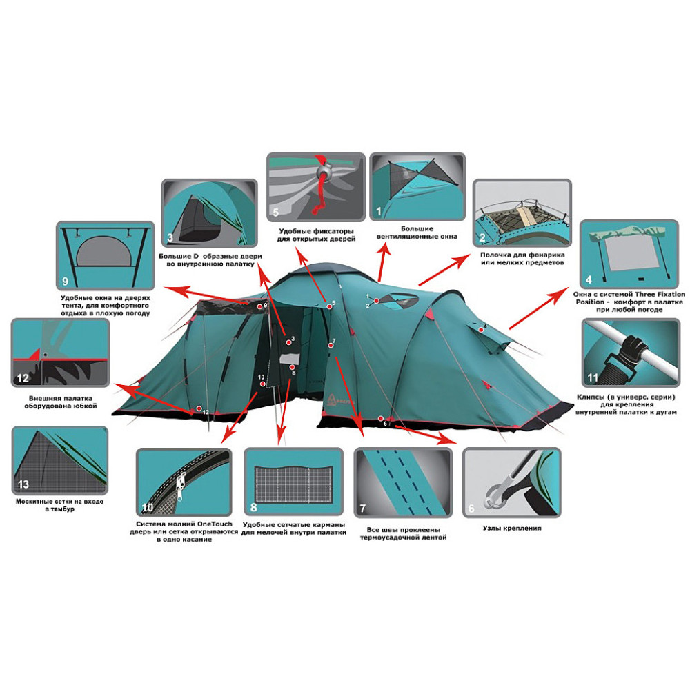 - Внешний тент имеет пропитку, задерживающую распространение огня - Входы всех спальных отделений продублированы москитной сеткой
