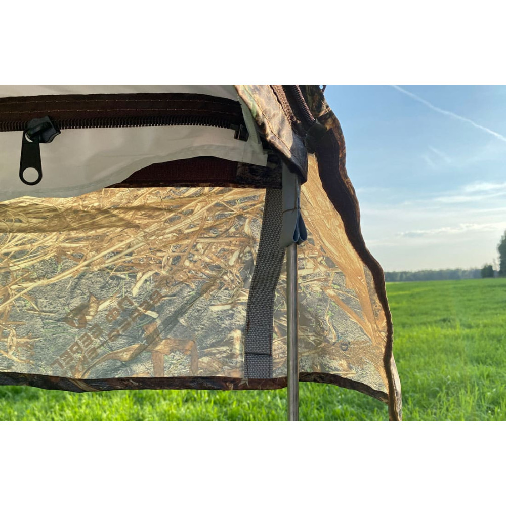 Веранда выполнена из ткани Оксфорд и москитной сетки с мелкой ячейкой, в нижней части имеется широкая юбка с оттяжными петлями для крепления.