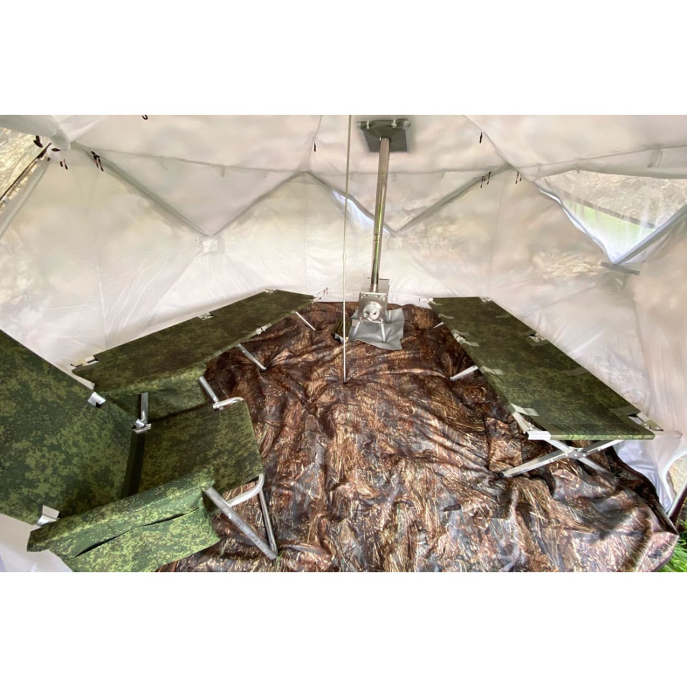 Внутренний тент изготовлен из ткани Оксфорд с толщиной нити 240 Den, пропитка PU 2000 мм водяного столба. Внутренний тент с полом на молнии обеспечивает поддержание стабильного комфортного микроклимата в палатке. Пол пристегивается на молнию на уровне выше земли 10 см. На замену стандартному полу есть возможность пристегнуть 100% непромокаемый пол из ПВХ (этот вариант пола необходим при эксплуатации палатки в условиях повышенной влажности).