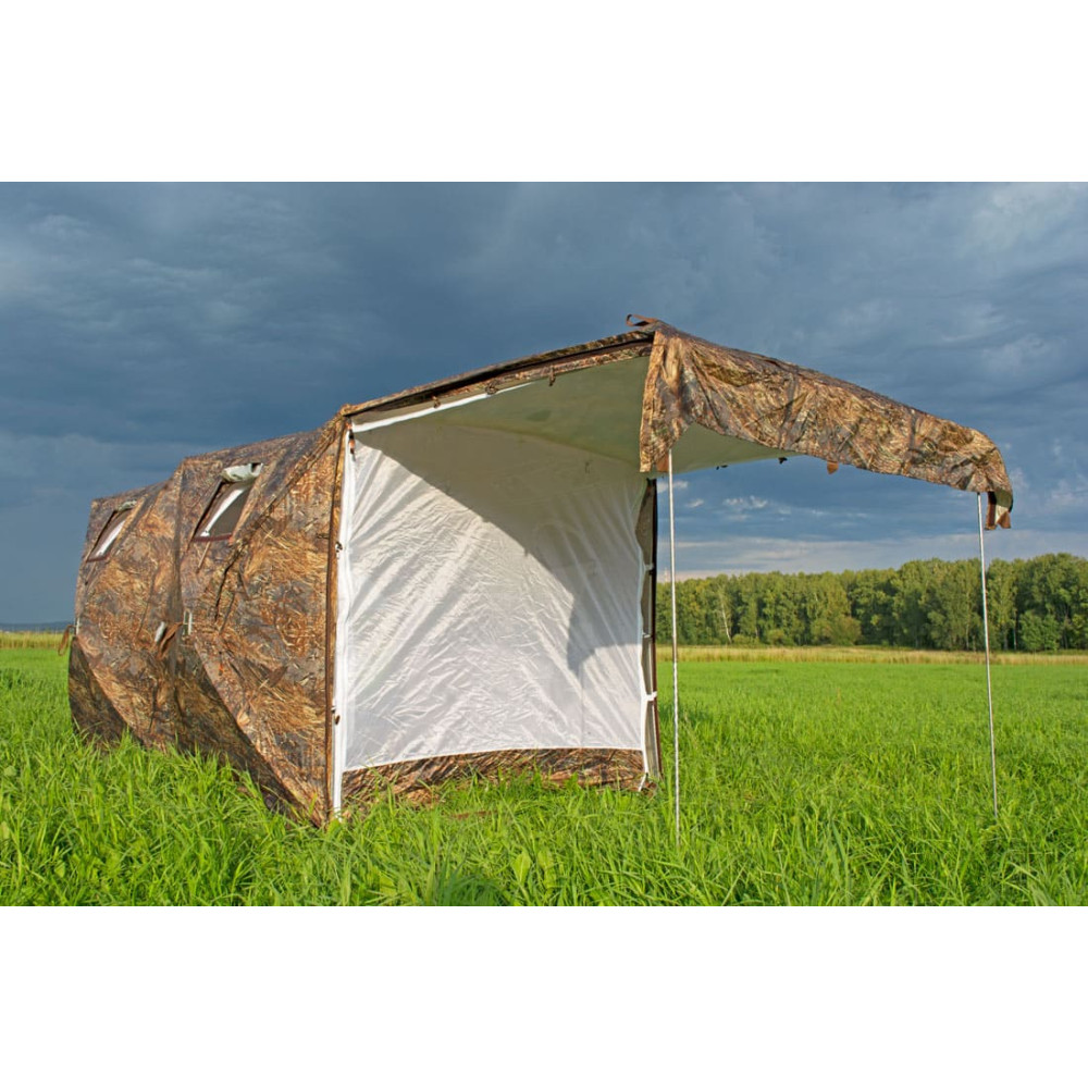 - Откидная торцевая стенка. С помощью этой функции кемпинг в теплое время года становится более комфортным. Стенка послужит навесом для оптимизации пространства перед палаткой: под навесом можно организовать обеденную зону. Для установки навеса в комплекте с палаткой предназначены опорные стойки из стеклопластика. При установке откидной стенки вход в палатку закрывается москитной сеткой.