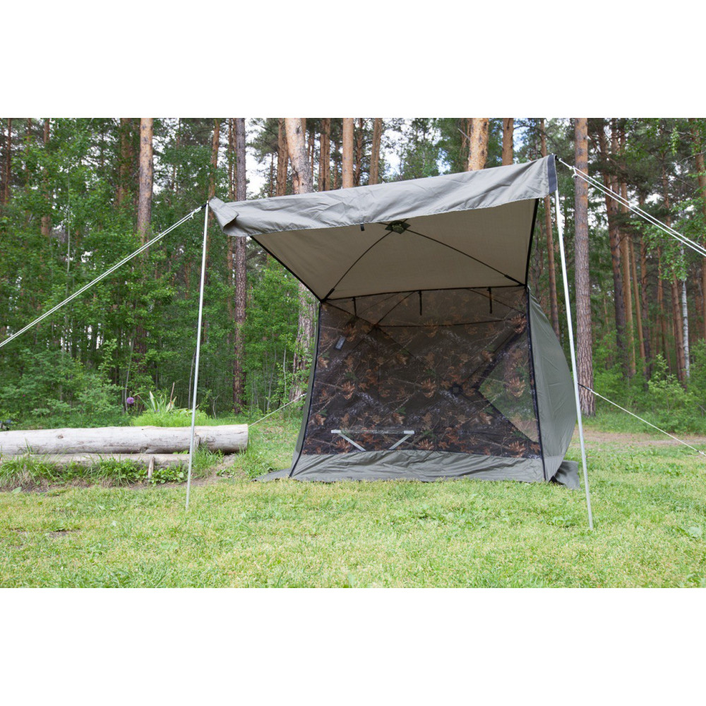 За 30 секунд, путем открытия двух молний, одна сторона палатки поднимается и становится крышей. Палатка превращается в укрытие для летней рыбалки или просто шатром. Установив палатку на берегу водоема, Вы находитесь в укрытии и в то же время имеете открытый доступ к воде и абсолютно свободно работаете со снастями. В то же время вещи, прикормка, насадка, снасти - всё находится рядом в укрытии.