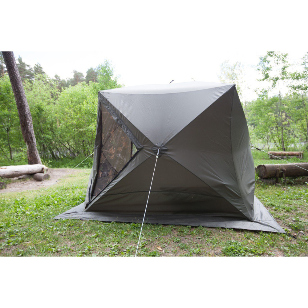 Обратите внимание, что тент не обладает дышащими свойствами. Для циркуляции воздуха внутри палатки рекомендуем использовать форточки и бегунок на входной двери. Также необходимо укрепить палатку растяжками, независимо от наличия ветра.