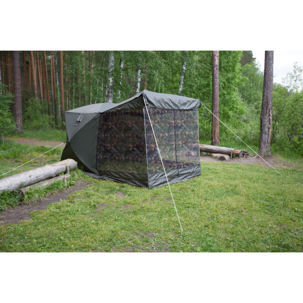 Обратите внимание, что тент не обладает дышащими свойствами. Для циркуляции воздуха внутри палатки рекомендуем использовать форточки и бегунок на входной двери. Также необходимо укрепить палатку растяжками, независимо от наличия ветра.