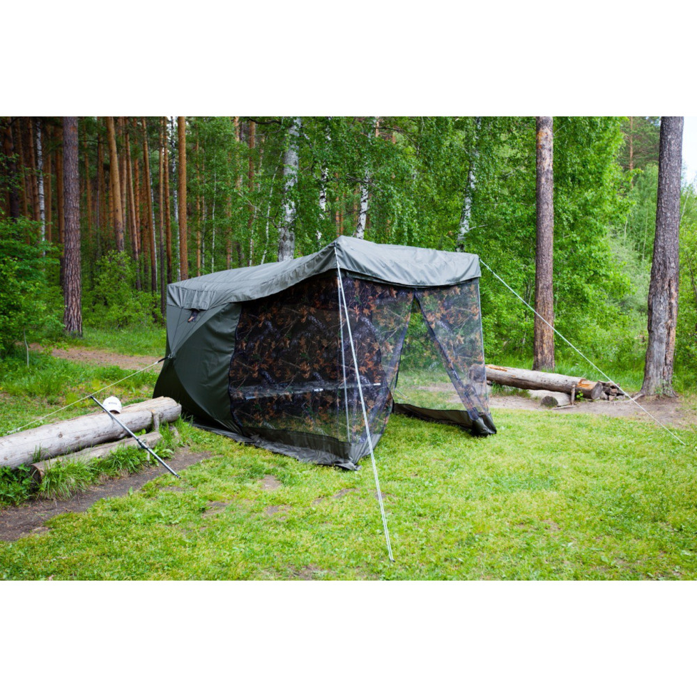 За 30 секунд, путем открытия двух молний, одна сторона палатки поднимается и становится крышей. Палатка превращается в укрытие для летней рыбалки или просто шатром. Установив палатку на берегу водоема, Вы находитесь в укрытии и в то же время имеете открытый доступ к воде и абсолютно свободно работаете со снастями. В то же время вещи, прикормка, насадка, снасти - всё находится рядом в укрытии.