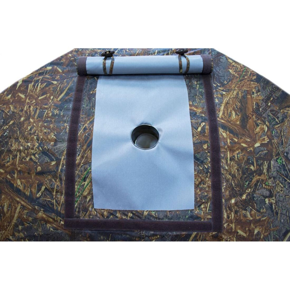 «Спутник-3» оснащен разделкой дымохода из огнеупорной ткани с кольцом из нержавеющей стали (70 мм) и съемным полотном жаропрочной ткани на липе для защиты стенки палатки от повреждений