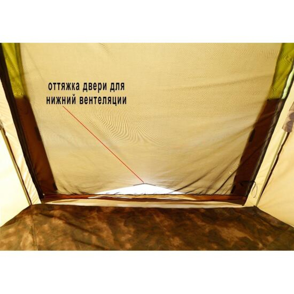 В куполе палатки встроен вытяжной клапан, защищенный противомоскитной сеткой и обеспечивающий верхнюю вентиляцию жилого пространства укрытия