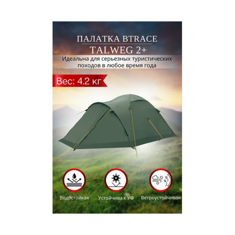 | Габариты установленной палатки(Длина, ширина, высота)300х220х120 ОписаниеХарактеристикиОтзывы Палатка BTrace Talweg 2+ Особенности: - Двухслойная палатка с двумя входами- Внешний тент палатки устойчив к ультрафиолетовому излучению- Внешний тент имеет пропи | BTRACE, Материал каркаса:сплав ALU 7006 8,5 мм, Материал тента:100% полиэстер 75D/190Т RipStop, Водостойкость тента (мм в. ст):6000, Материал дна:100% полиэстер 75D/190Т, Водостойкость дна (мм в. ст.):8000, Материал внутренней палатки:100% полиэстер, Цвет внутренней палатки:Желтый, Вес (г):4150, Количество слоев:2, Устойчивость к ультрафиолетовому излучению:Да, Количество мест:2, Количество входов:2, Снежная юбка :да, Комплектация:Колышки, оттяжки, инструкция, Размер в упаковке (см):45х21х20, Высота (см):120, Наружний габарит (см):300*220, Тамбур (см):1х100, 1х50, Упаковка:Тканевая сумк |