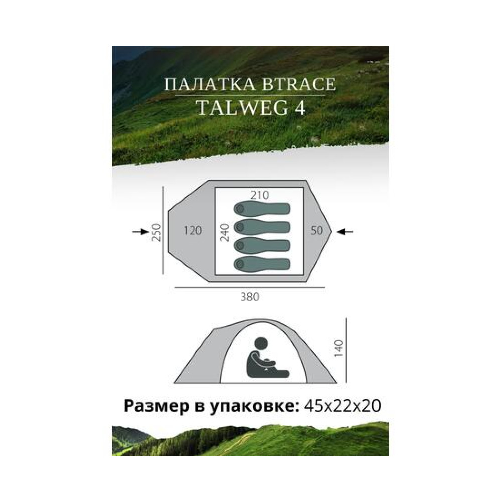 | Габариты установленной палатки(Длина, ширина, высота)380х250х140 ОписаниеХарактеристикиОтзывы ПАЛАТКА BTRACE TALWEG 4 Особенности: - Двухслойная палатка с двумя входами- Внешний тент палатки устойчив к ультрафиолетовому излучению- Внешний тент имеет пропит | BTRACE, Материал каркаса:сплав ALU 7006 8,5 мм, Материал тента:100% полиэстер 75D/190Т RipStop, Водостойкость тента (мм в. ст):6000, Материал дна:100% полиэстер 75D/190Т, Водостойкость дна (мм в. ст.):8000, Материал внутренней палатки:100% полиэстер, Цвет внутренней палатки:Желтый, Вес (г):5000, Количество слоев:2, Устойчивость к ультрафиолетовому излучению:Да, Количество мест:4, Количество входов:2, Снежная юбка :да, Комплектация:Колышки, оттяжки, инструкция, Размер в упаковке (см):45х22х20, Высота (см):140, Наружний габарит (см):380*250, Тамбур (см):1х120, 1х50, Упаковка:Тканевая сумка |