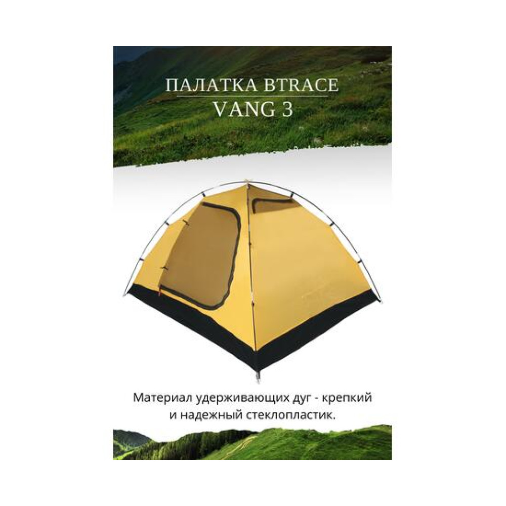 Особенности: - Двухслойная палатка с двумя входами- Вход спального отделения продублированмоскитной сеткой- Увеличенный тамбур, два вентиляционныхклапана, все швы проклеены- Идеальна для туристических походов ввесеннее, летнее и осеннее время Характеристики: Производитель:BTRACEМатериал каркаса:фибергласс 8,5 ммМатериал тента:100% полиэстер 75D/190T PU W/RВодостойкость тента (мм в
