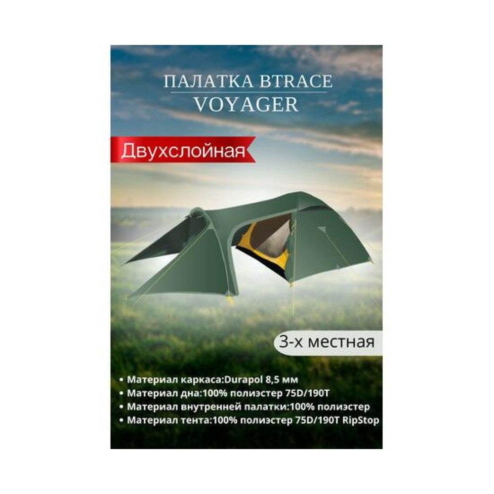 Особенности: - Двухслойная палатка с тремя входами- Два входа в тамбур- Огромный тамбур- Внешний тент палатки устойчив к ультрафиолетовому излучению- Внешний тент имеет пропитку, задерживающую распространение огня- Два вентиляционных клапана- Светоотражающие оттяжки и элементы на вентиляции- Все швы прокл- Идеальна для туристических походов в весеннее, летнее и осеннее время Характеристики: Производитель:BTRACEМатериал каркаса:Durapol 8,5 ммМатериал тента:100% полиэстер 75D/190Т RipStopВодостойкость тента (мм в