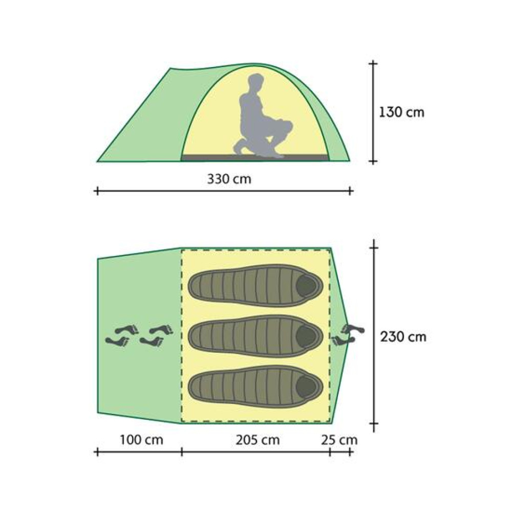 | Вместимость (чел)3 | Водостойкость тента6000мм | Габариты установленной палатки(Длина, ширина, высота)330x230x130 см |