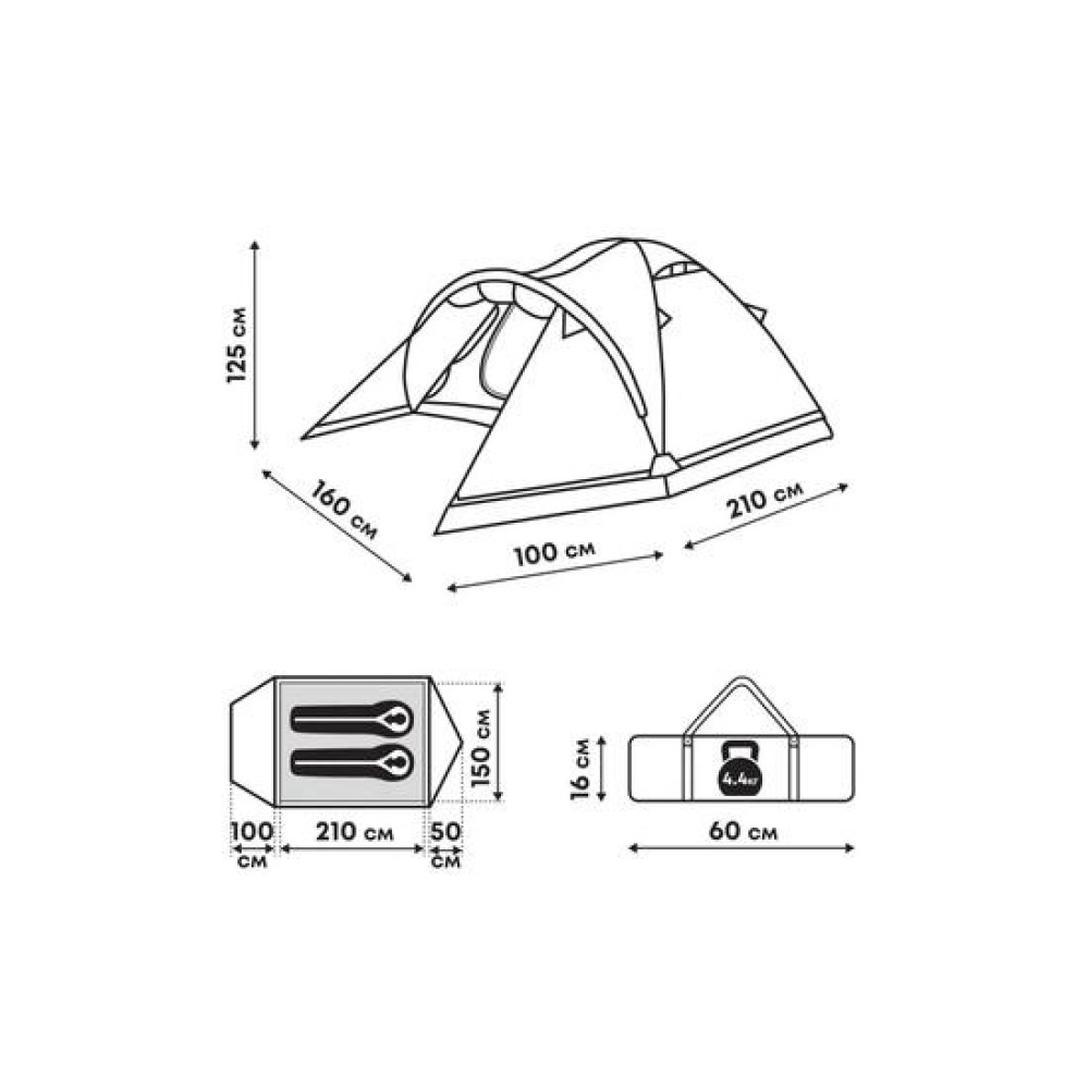 Характеристики: Тип палатки: Треккинговая;Сезон: Весна, лето, осень;Вместительность: 2-местная;Тент: Двухслойный;Материал тента: Полиэстер 210T 68D;Материал внутренней палатки: Полиэстер;Материал дна: Терпаулинг;Материал каркаса: Фибергласс;Диаметр дуг каркаса, мм: 7.9;Водостойкость тента, мм: 5000;Водостойкость дна, мм: 10000;Герметизация швов: Проклеены;Количество комнат: 1;Количество входов: 2;Наличие тамбура: Есть;Наличие окон: Нет;Противомоскитная сетка: Есть;Штормовые оттяжки: Есть;Мгновенная сборка: Нет;Цвет: Зелёный;Вес, кг: 4.35;Размеры в собранном виде, Д*Ш*В, см: 360*160*125;Размер спального места, Д*Ш, см: 210*150;Размер в сложенном виде, Д*Ш*В, см: 60*16*16.
