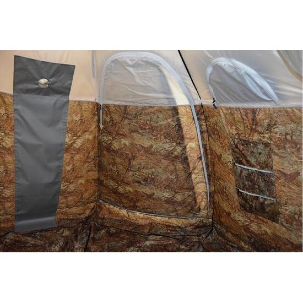 Оборудование палатки УП-5 Люкс Берег Один основной вход с антимоскитной сеткой и возможностью присоединения распашной двери и тамбураЧетыре дополнительных арочных входа с антимоскитными сетками.Две молнии для монтажа перегородки.Два смотровых окна.Разделка дымохода