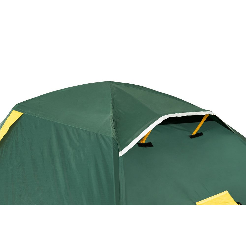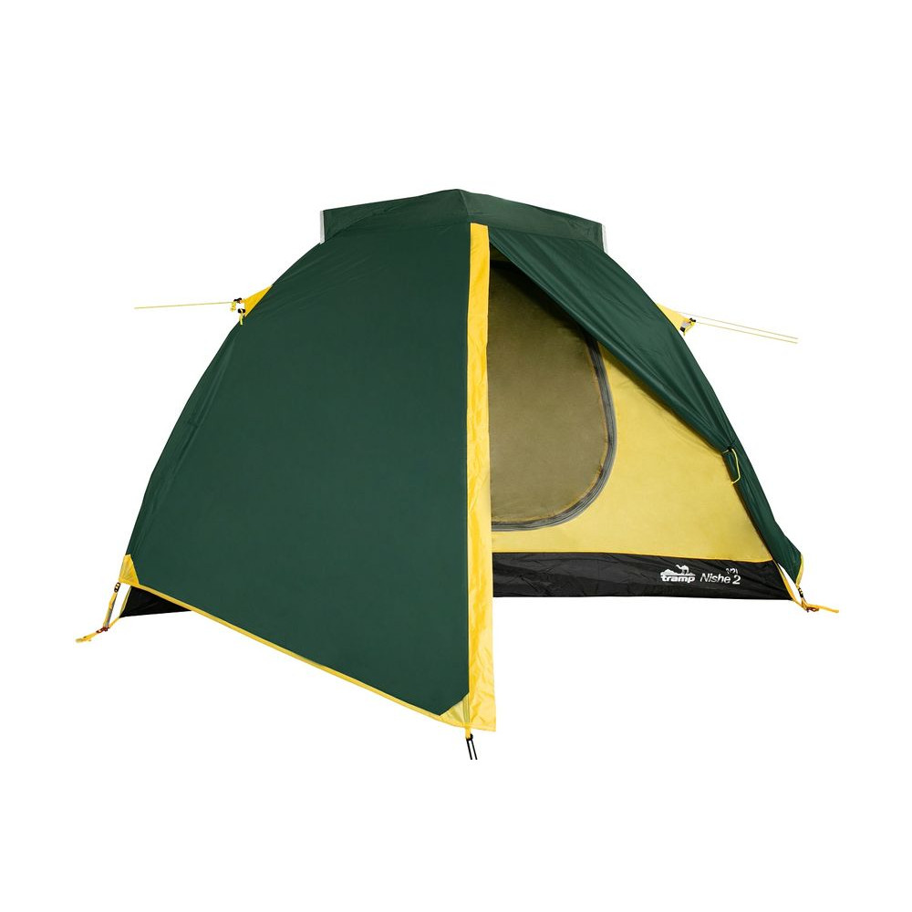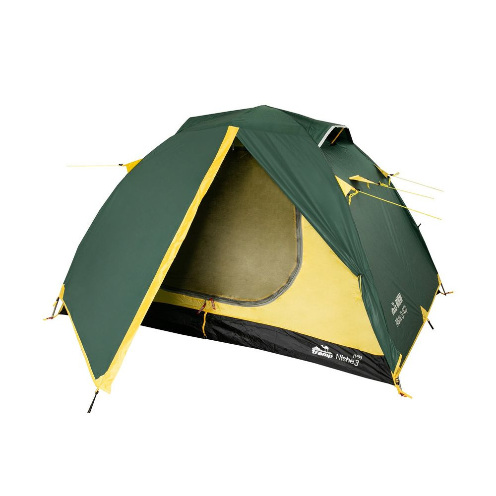 Палатка TRAMP NISHE 3 (V2) - туристическая походная модель для установки лагеря: весной, летом, осенью. Штатно рассчитана на три человека, имеет два отдельных входа. В наличии имеются стальные колышки, с расчетом на всю палатку и на штормовые растяжки. Конструкцию имеет форму полусферы, которая удерживается благодаря внутреннему стеклопластиковому каркасу из двух дуг диметром 8.5 мм. При возведении палатки сначала устанавливается внутренняя часть на дугах, а сверху просто покрывается тентом.