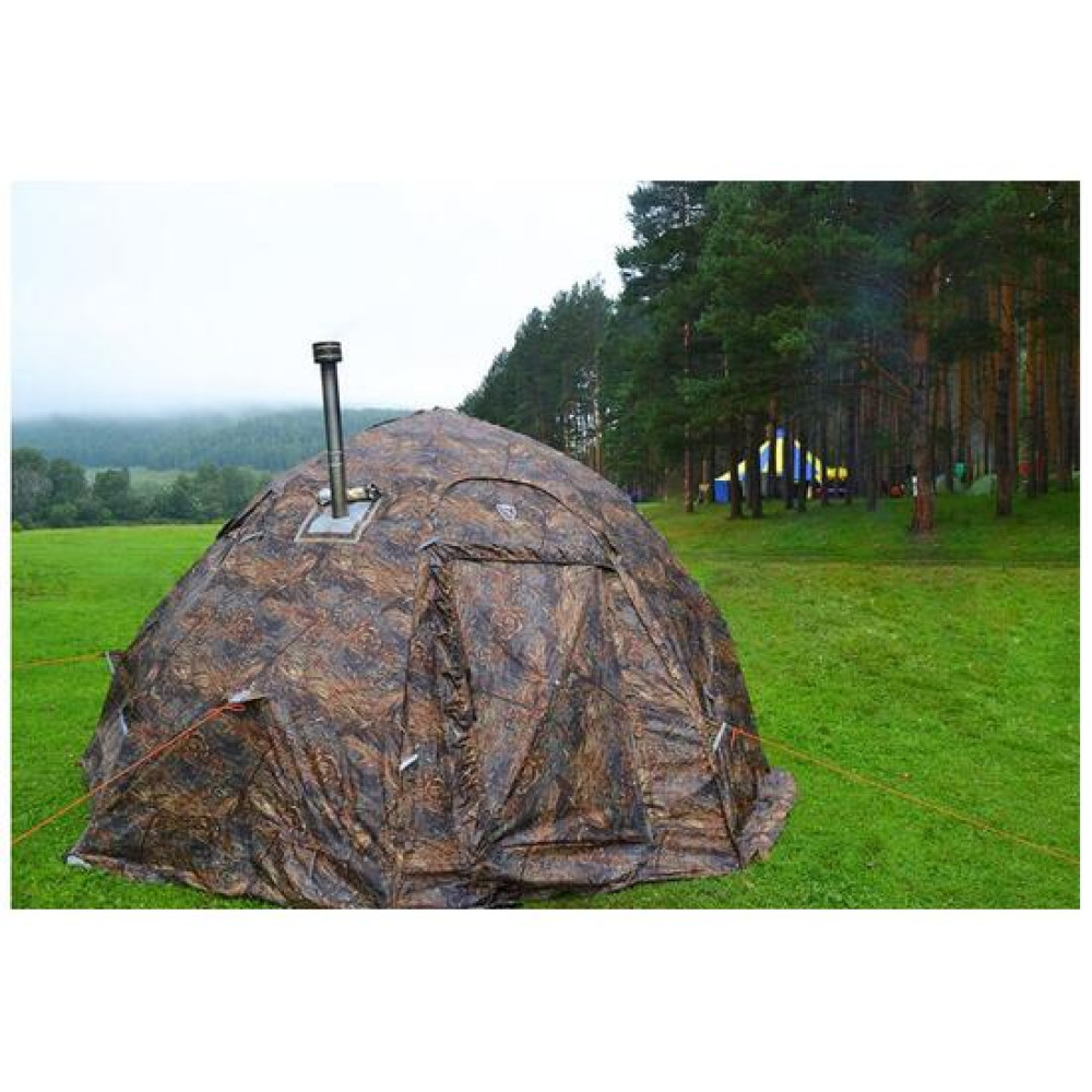 Объем - 0,22 м3КомплектацияПалатка, шт.Внешний тент+каркасРаспашная дверь, шт.1Козырек на вход, шт.1Колышки, шт.24Съемный органайзер на липе, шт.1Съемный карман на липе, шт.1Оттяжка веревочная, м50Полка-сетка под куполом, шт.1Сумка, шт.1Комплект ЗИП, шт.1Стойки под козырек, компл.1Инструкция и гарантийный талон, шт.1Используемые материалыВнешний тентОксфорд 300 PU 4000 ммКаркасАвиационный сплав алюминия В95Т1 / пруток 10 ммУпаковкаОксфорд 600 PU 3000 мм + ПВХ / картон МЕРЫ ПРЕДОСТОРОЖНОСТИ ► Тщательно крепите палатку на поверхности при сильных порывах ветра во избежание опрокидывания!► Не рекомендуется использование печи и других приборов обогрева в палатках при ветре более 10 м/с!► Не допускайте к использованию лиц в нетрезвом состоянии и малолетних детей!► Не используйте для розжига печи легковоспламеняющиеся вещества!► ЗАПРЕЩАЕТСЯ использование газа, газового оборудования и устройств на жидком топливе для отопления!► Обязательно применение пожарного извещателя (датчика дыма) при отоплении палатки