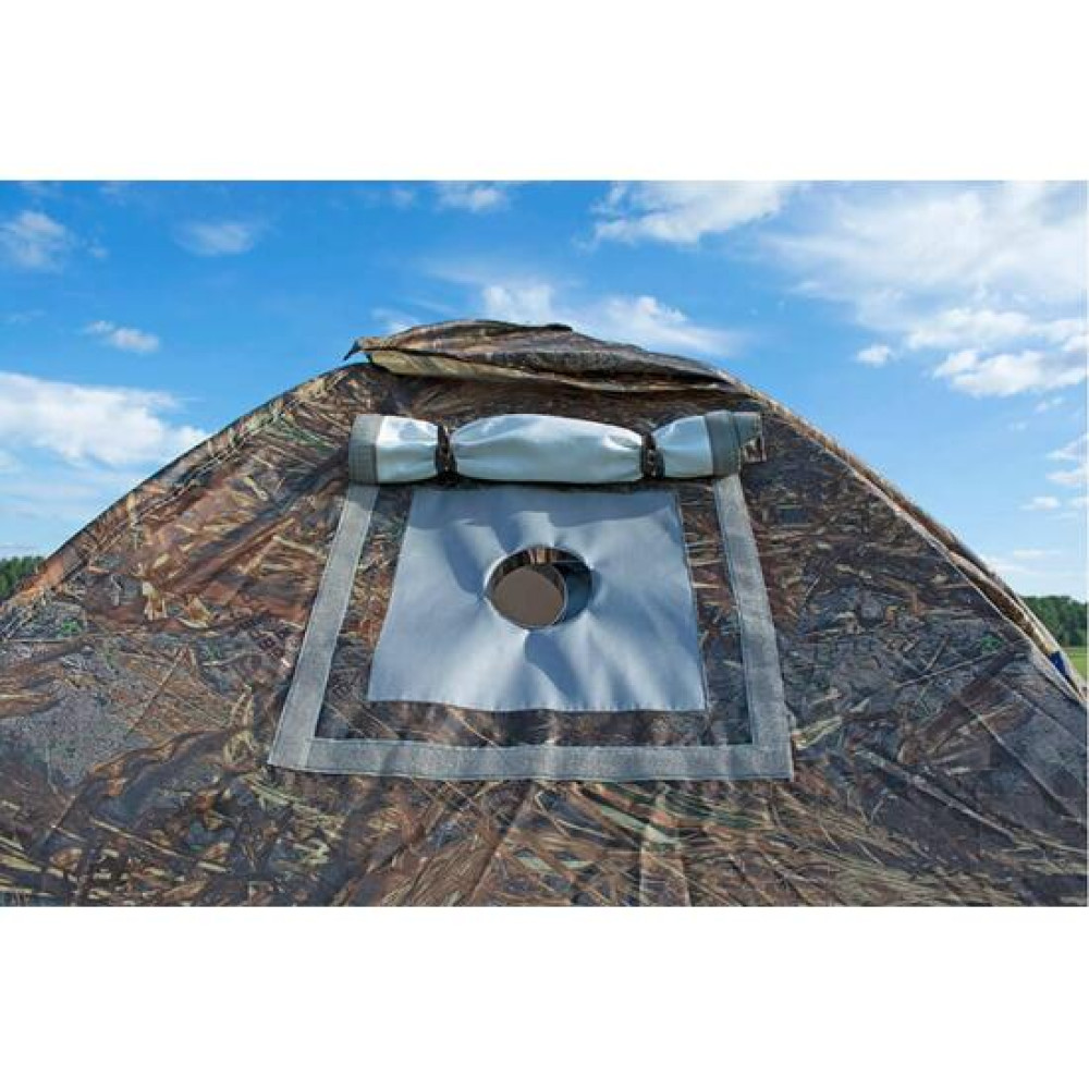 Состоит из огнеупорной вставки (силиконовая термоткань) и кольца из нержавеющей стали, закрытая защитным клапаном со стороны внешнего тента