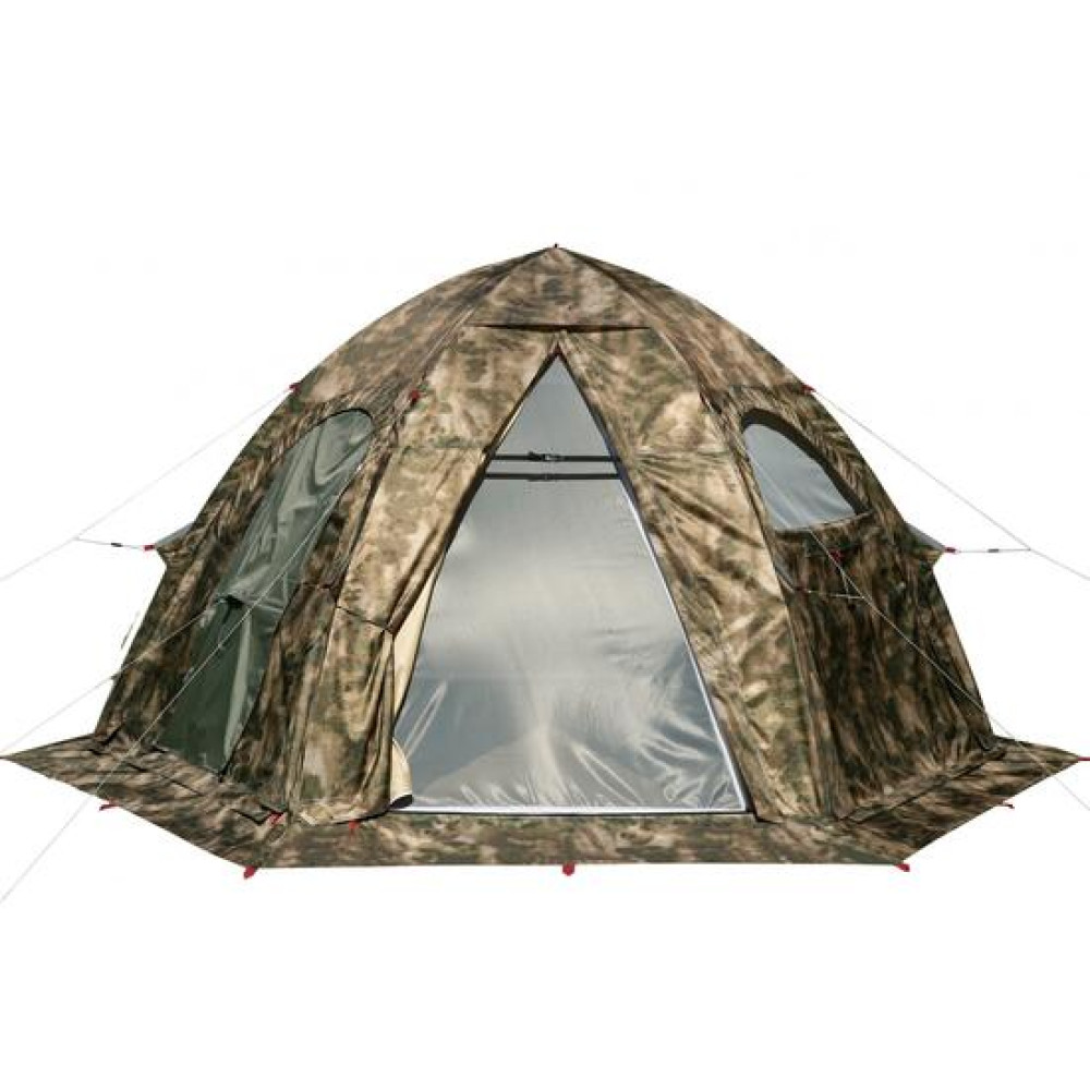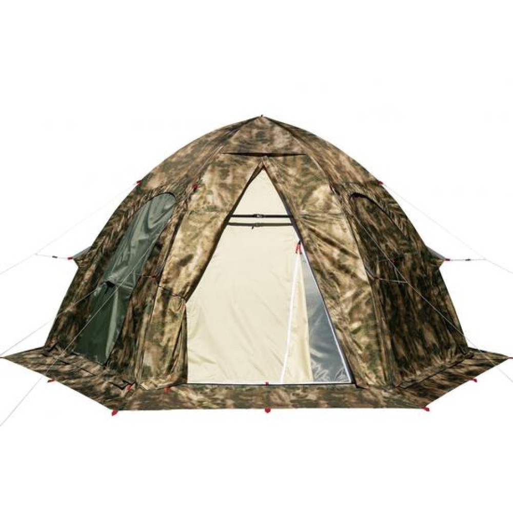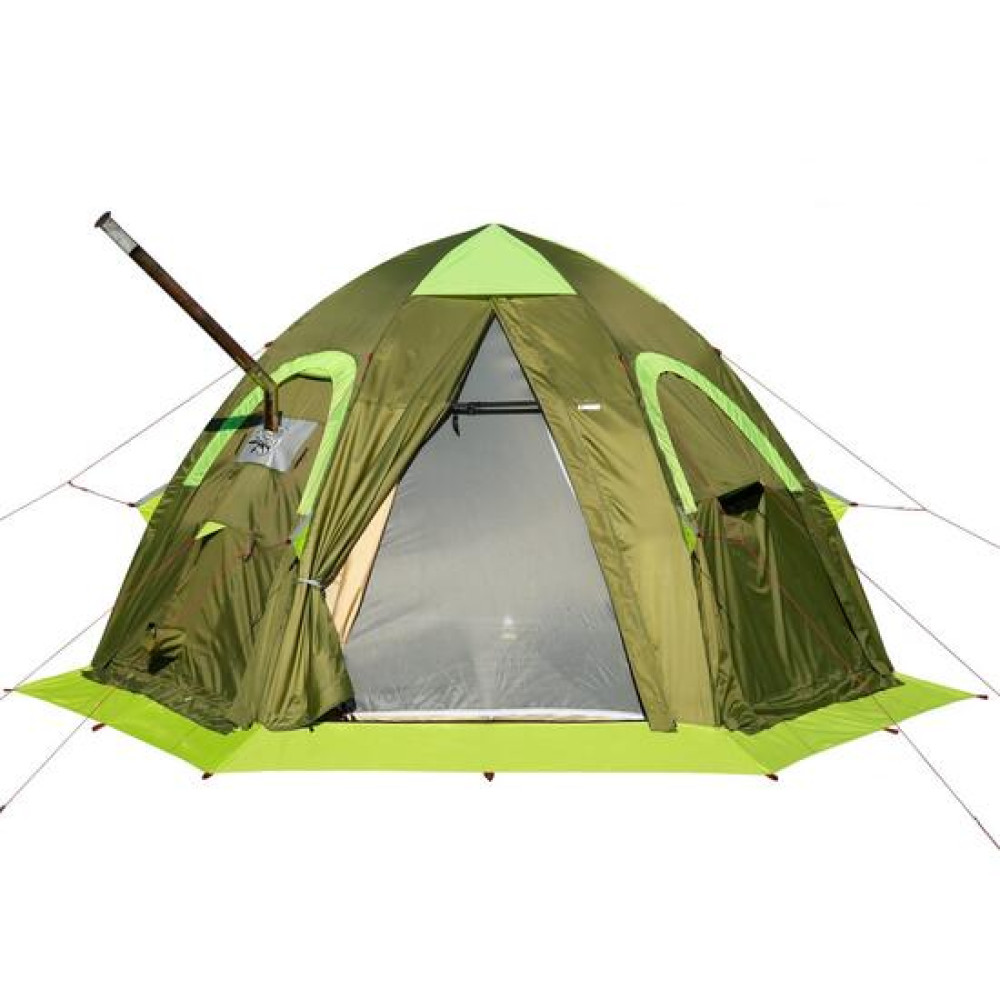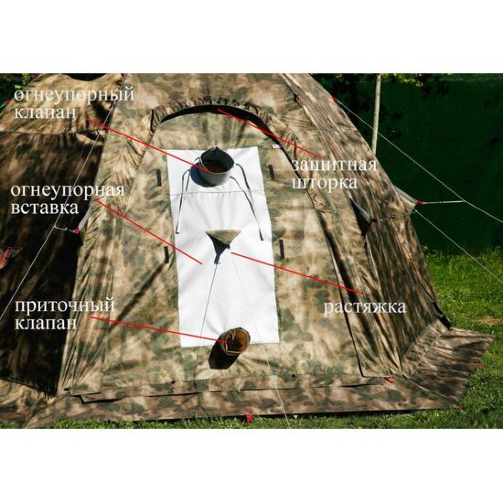 Все три системы вентиляции полностью защищены снаружи от затекания воды во время дождя и оснащены москитными сетками.Палатка с печкой! Палатка оснащена универсальной системой установки отопительной печи, включающей в себя огнеупорную стенку, продублированную на внешнем и внутреннем тентах и внешнюю защиту этой стенки от дождя