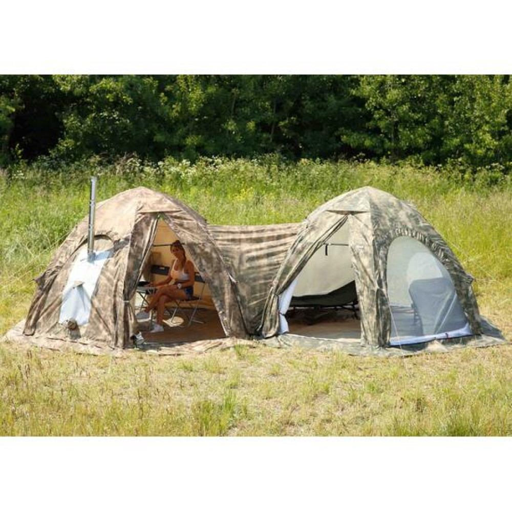 Модульная конструкция позволяет по мере необходимости увеличивать площадь укрытия за счет присоединения в единое жилое пространство нужного количества палаток между собой, что позволит организовать базовый лагерь рыбаков и охотников или палаточный городок для длительного проживания во время экспедиций