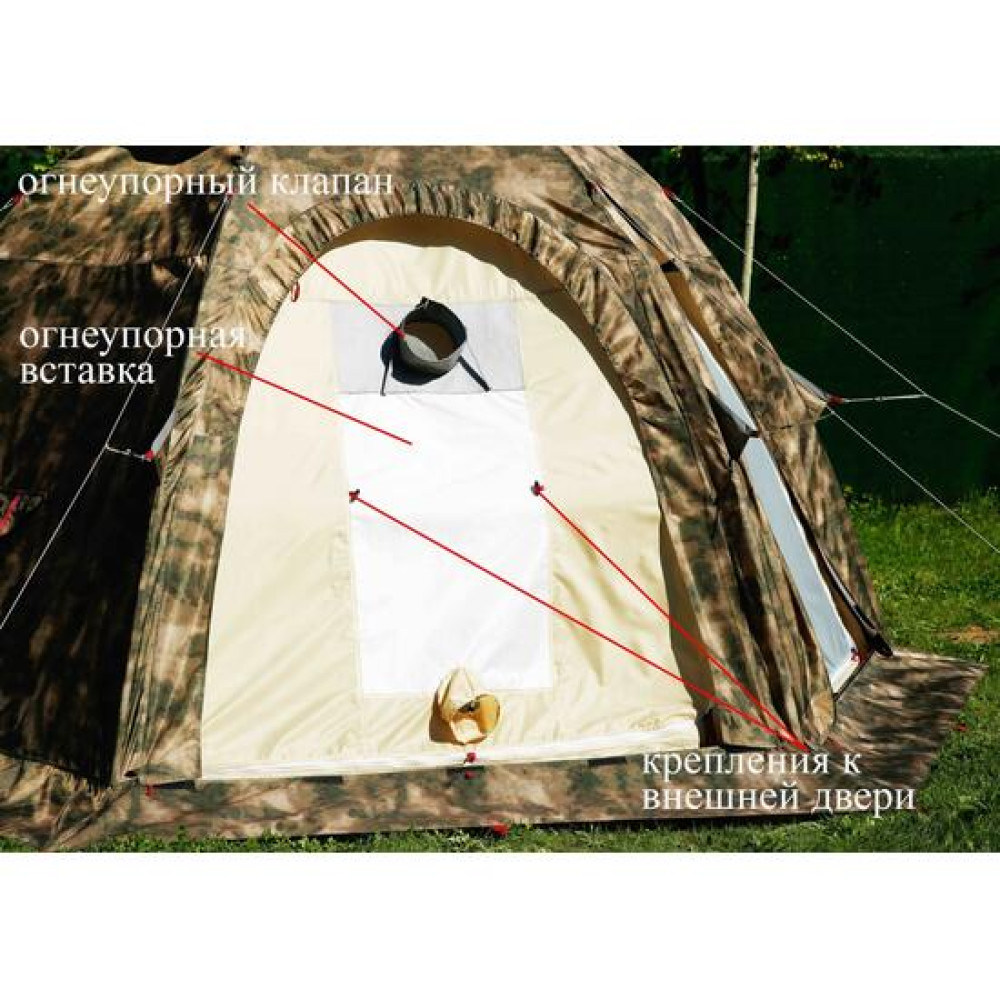 В полотнище дверного проема внутреннего тента также встроена огнеупорная вставка, которая защищает поверхность стенки, где возможен ее контакт с печью и вытяжной трубой