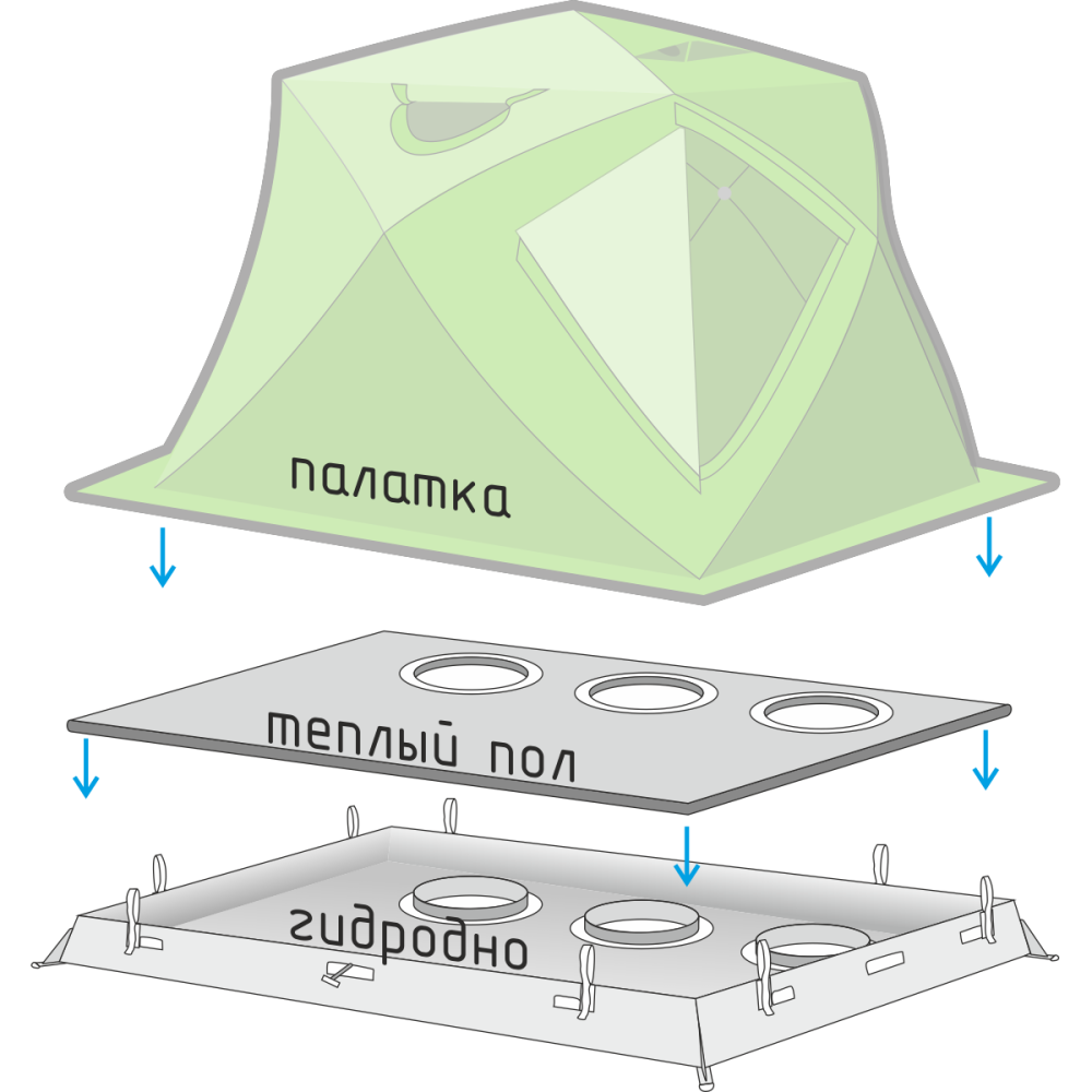 Расположение пола сверху, исключает возможное задувание по всему нижнему периметру. При этом теплая палатка образуют цельное и очень устойчивое укрытие, способное защитить пользователя от сильного ветра и мороза.