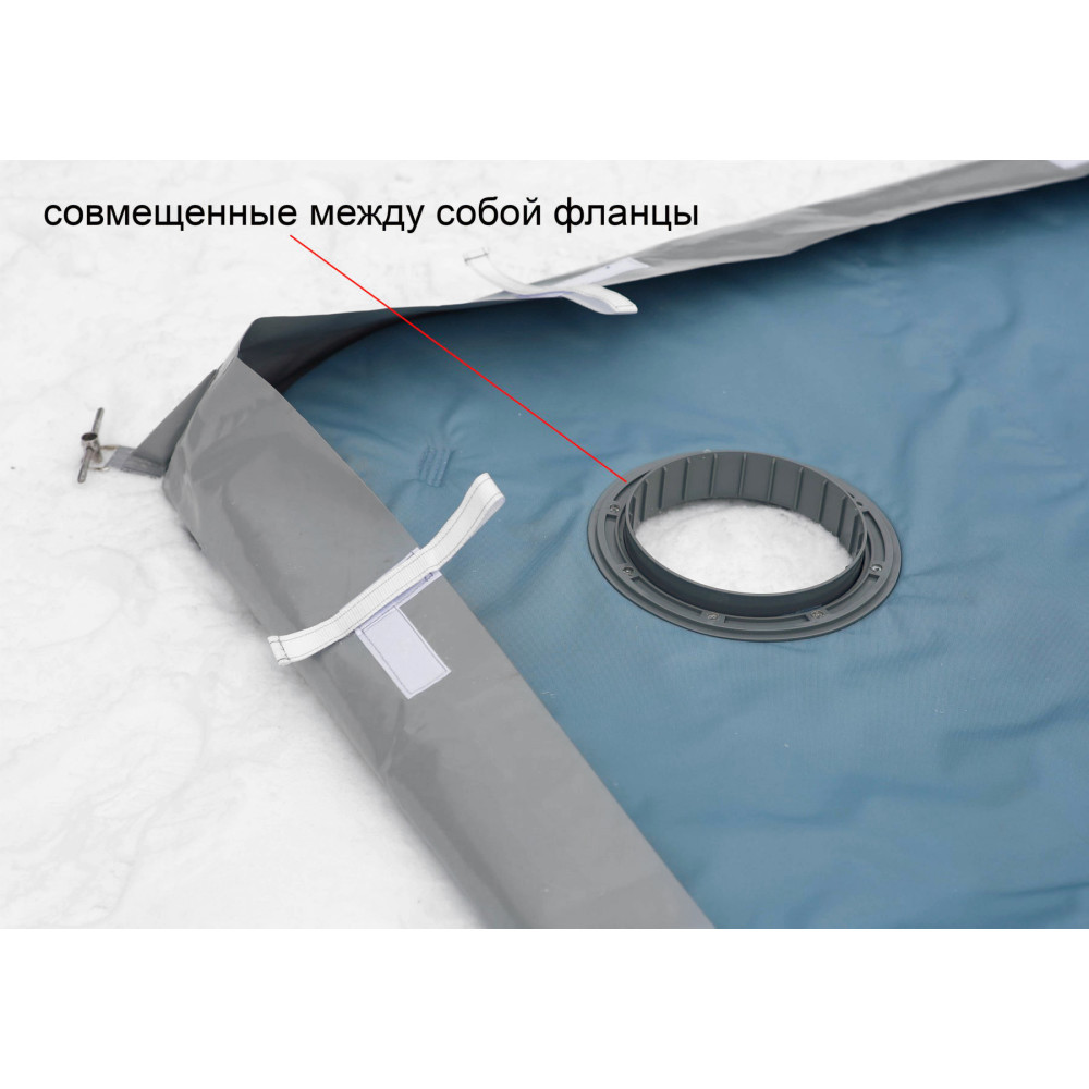 В процессе эксплуатации товар расстилается на лед и крепится ввертышами с небольшой натяжкой по углам за петли с металлическими кольцами. Ребра жесткости на крепежных петлях обеспечивают вертикальное расположение бортов что бы не затекала вода, что в свою очередь позволяет производить разборку и сложение в сухом и чистом состоянии.