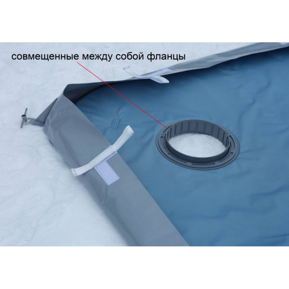 На поверхностях установлено три отверстия под лунки, которые совмещаются и тем самым фиксируют две части гидро-термо-дна между собой. Фланец выполнен без кольцевого бортика, благодаря чему он может плотно надеваться на него.