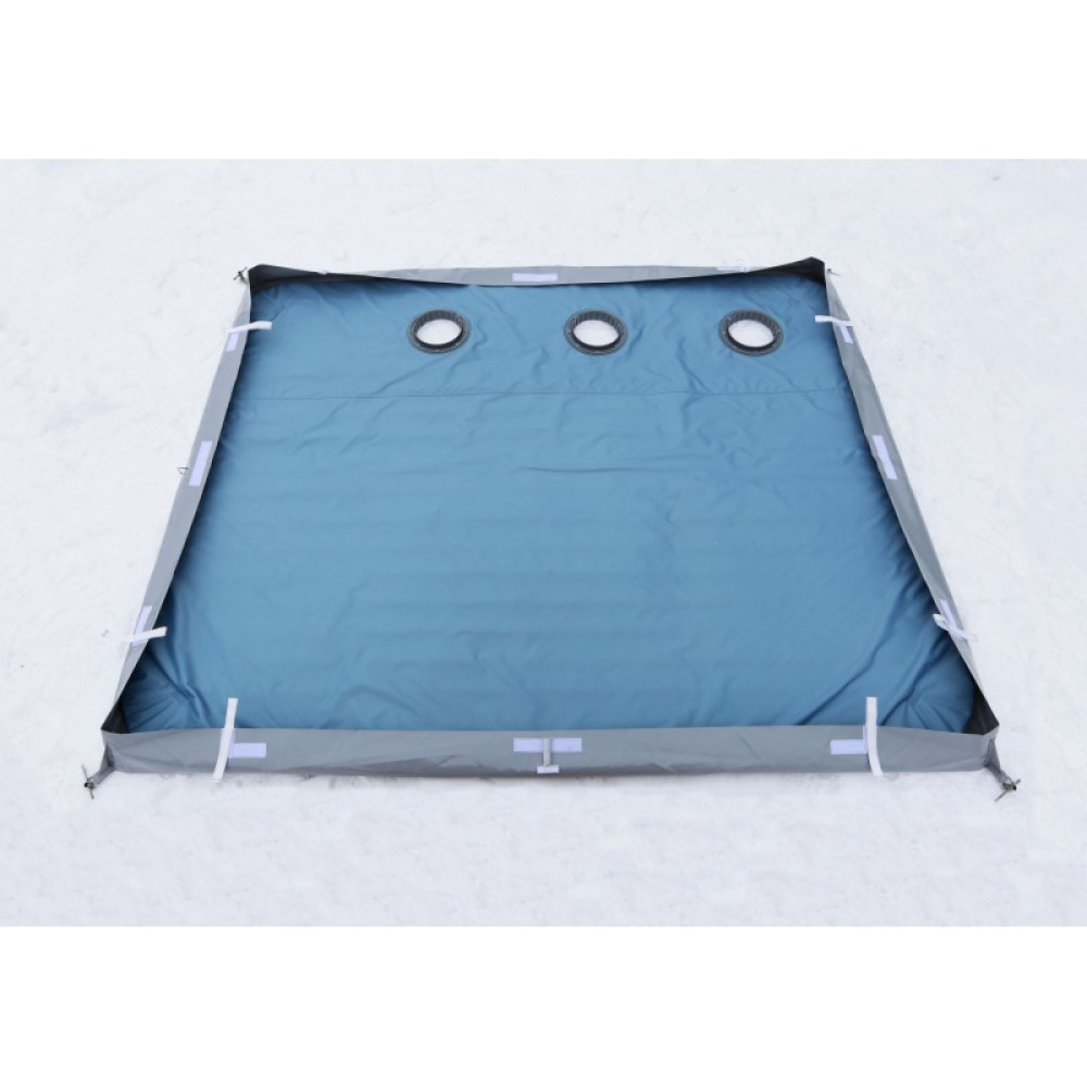 В процессе эксплуатации продукт расстилается на лед и крепится ввертышами с небольшой натяжкой по углам за петли с металлическими кольцами. Ребра жесткости на крепежных петлях обеспечивают вертикальное расположение бортов исключая затекание воды, что в свою очередь позволяет производить разборку и сложение палатки в сухом и чистом состоянии.
