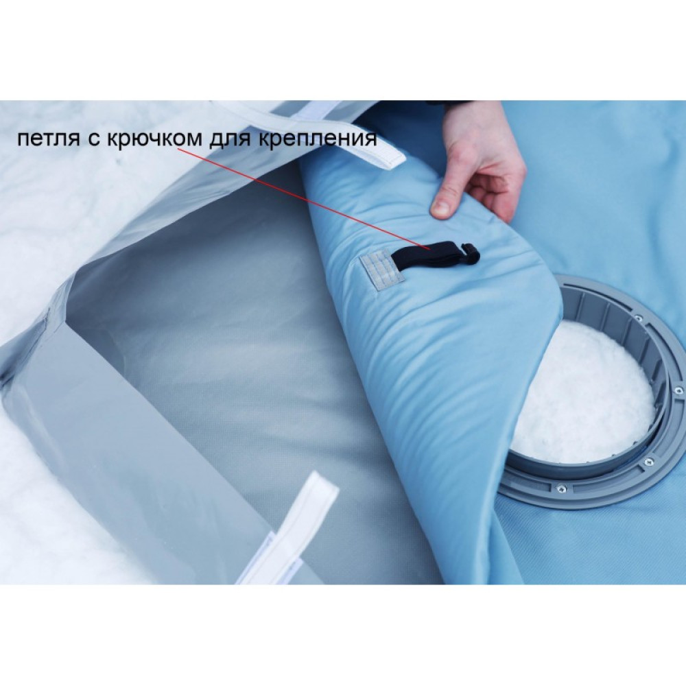 Опорная стойка для приточного клапана фиксируется "липучкой" на защитной планке и формирует защищенный от осадков воздушный зазор. Дополнительные петли позволяют перемещать волоком по льду раскрытую палатку, установленную в корытообразном днище, вместе со снаряжением, расположенном внутри помещения. Петли расположены в удобном для перемещения направлении.