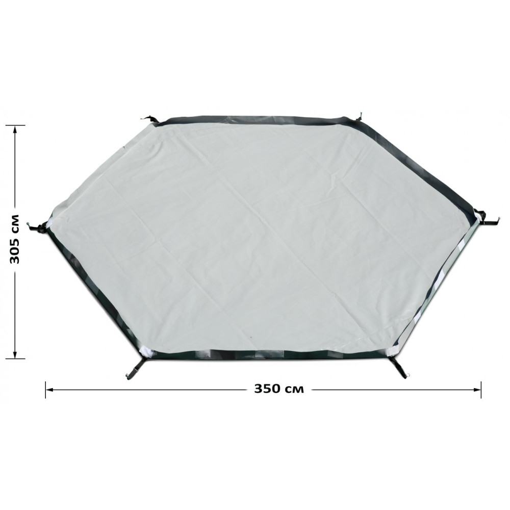 Гидроизоляционное дно изготовлено из прочного морозостойкого материала ПВХ плотностью 630 г/м², дно размером 305 х 350 см выполнено по шестигранной форме палатки в виде корыта с защитными бортиками высотой 6 см. К особенностям конструкции относится: