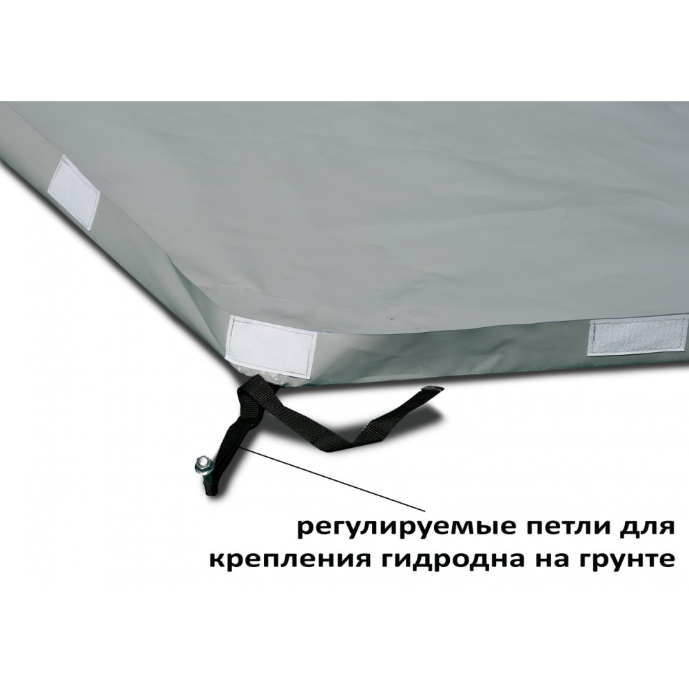 - По всем шести углам гидродна установлены стропельные петли для растяжки дна на грунте. Петли имеют регулировку по длине, что позволяет закреплять дно и внешнюю юбку палатки одним колышком (ввертышем) с внешней стороны палатки. (Рекомендуется отрегулировать длину всех шести петель гидродна под расположение петель для колышков на внешней юбке палатки с учетом ее оптимальной растяжки.)