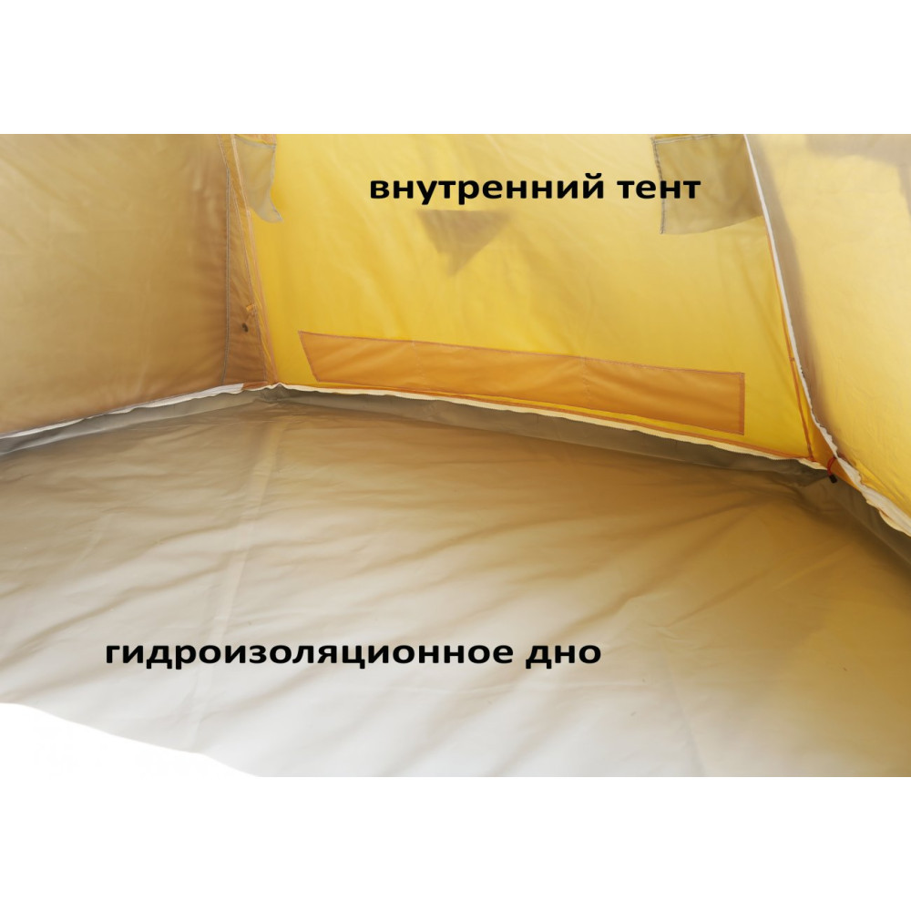 - Конструкция двухслойного тента палатки, с установленным гидроизоляционным дном, обеспечивает укрытию полную водостойкость жилого пространства. Конденсат, стекающий со стенок внешнего тента, а также вся вода от возможного затопления палатки во время дождя, скапливаются в меж-тентовом пространстве (на внутренней юбке палатки) и полностью отсекаются бортиками гидроизоляционного дна. Закрепленный на разъемной молнии влагозащитный пол обеспечивает герметизацию жилого пространства палатки, отсекая возможное проникновение насекомых.
