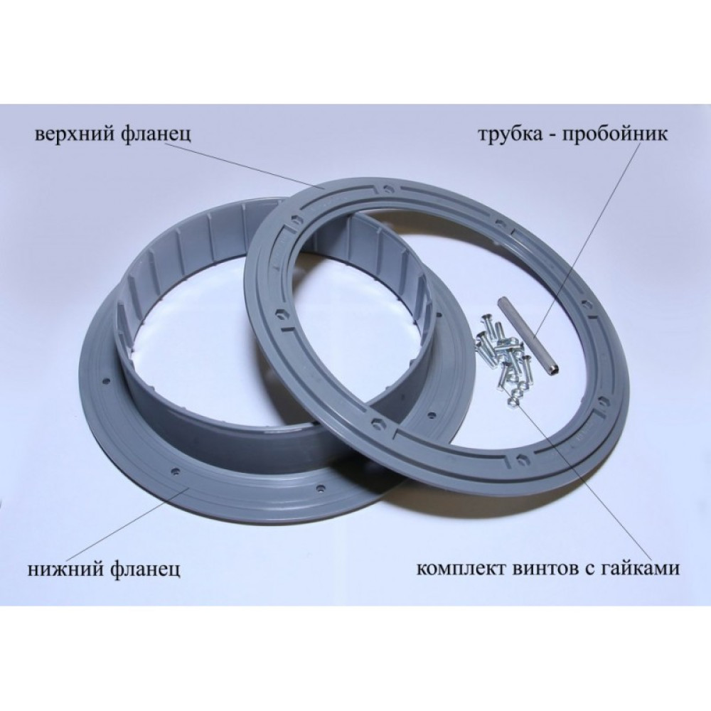 Фланцы представляют собой два литых диска из морозостойкого полипропилена с встречно смыкающимися плоскими поверхностями, на которых расположены кольцевые выступы, фиксирующие в сборе пол и надежно герметизирующие вырез. Нижний фланец имеет выступ, который образует кольцевой бортик с ребрами жесткости.