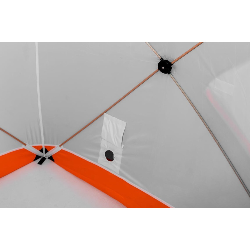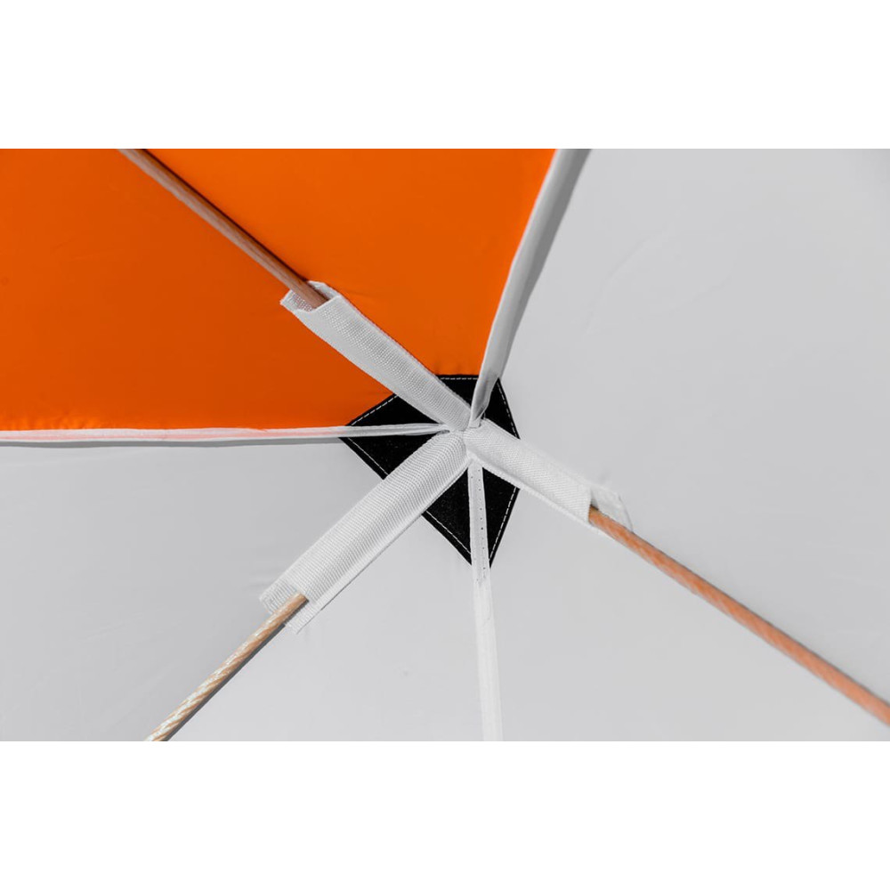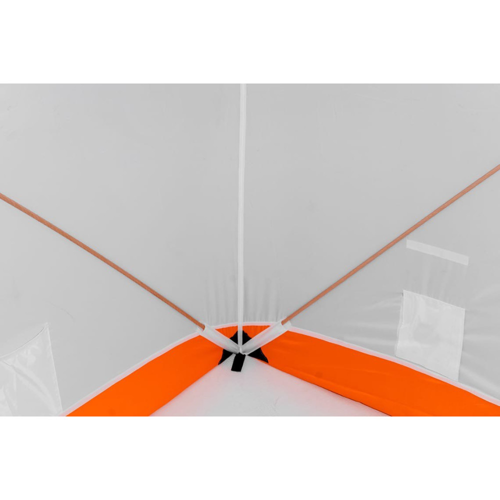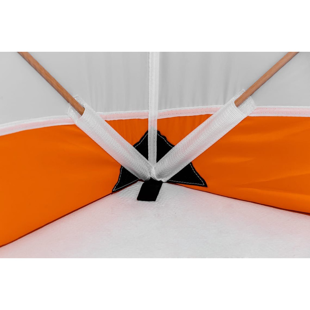 При изготовлении тента этой зимней палатки использована ткань Oxford 240 PU. Тент обладает водоотталкивающими свойствами, удерживает тепло, а белый цвет обеспечивает прекрасную светопроницаемость, что обеспечивает комфортные условия для проведения зимней рыбалки и не даёт глазам уставать.