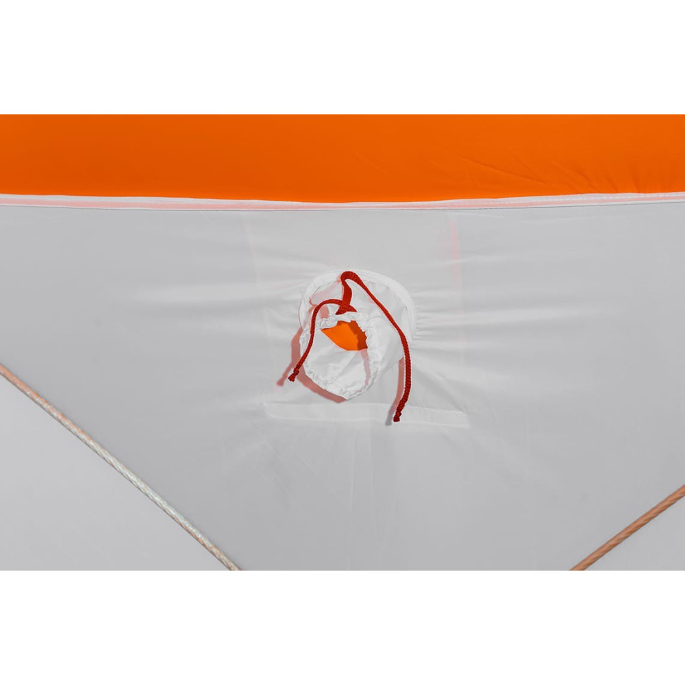 Палатка имеет выход под различные диаметры труб для использования отопительных приборов, окошко для притока воздуха и дополнительное окно на молнии и липучках для дополнительного проветривания или дополнительного света и обзора.