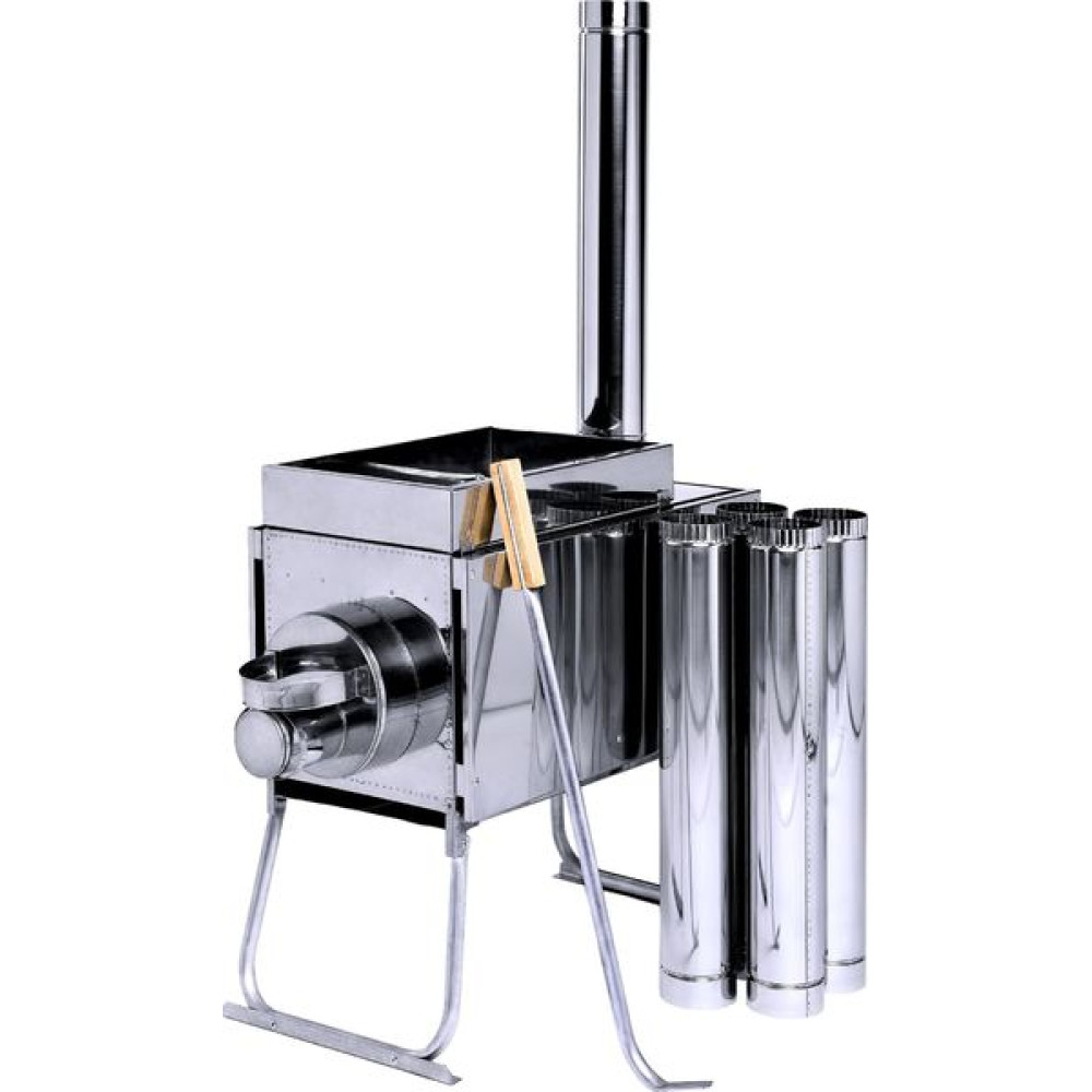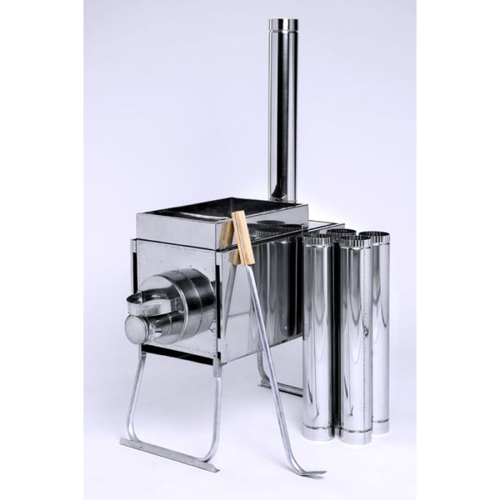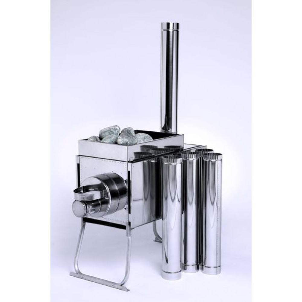Печь состоит из металлического короба с внутренней перегородкой-искрогасителем, с оснащенным выходом под дымоходную трубу, имеет четыре стационарных защитных экрана, съемный короб для закладки камней, облегченные алюминиевые складные ножки и дымоходную трубу, состоящую из сегментов.