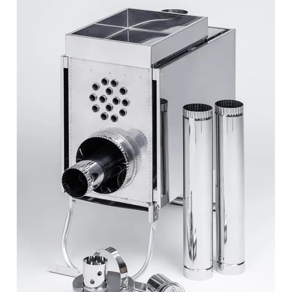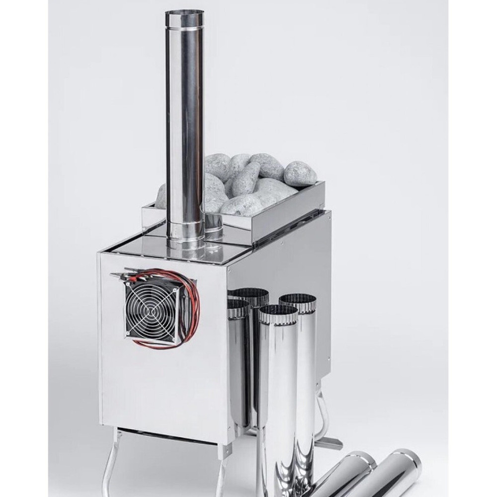 Печь "Инвент" малая с теплообменником состоит из металлического короба с проходящими сквозь него трубками и оснащенным выходом под дымоходную трубу, имеет четыре стационарных защитных экрана, быстросъёмный вентилятор, облегченные алюминиевые складные ножки, съемный короб для закладки камней и дымоходную трубу, состоящую из сегментов.