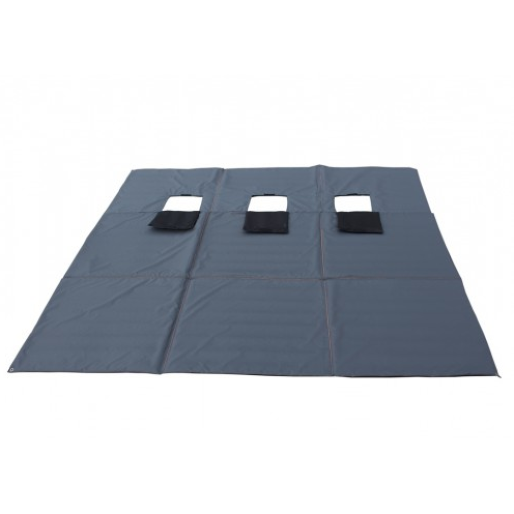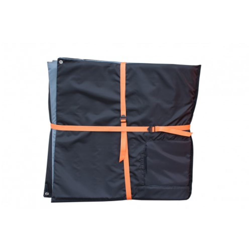 Теплый пол с тремя отверстиями под лунки, закрывающимися клапанами на липучке, по углам металлические люверсы для крепления ко льду. Пол складывается в квадрат, в сложенном виде фиксируется стропой.