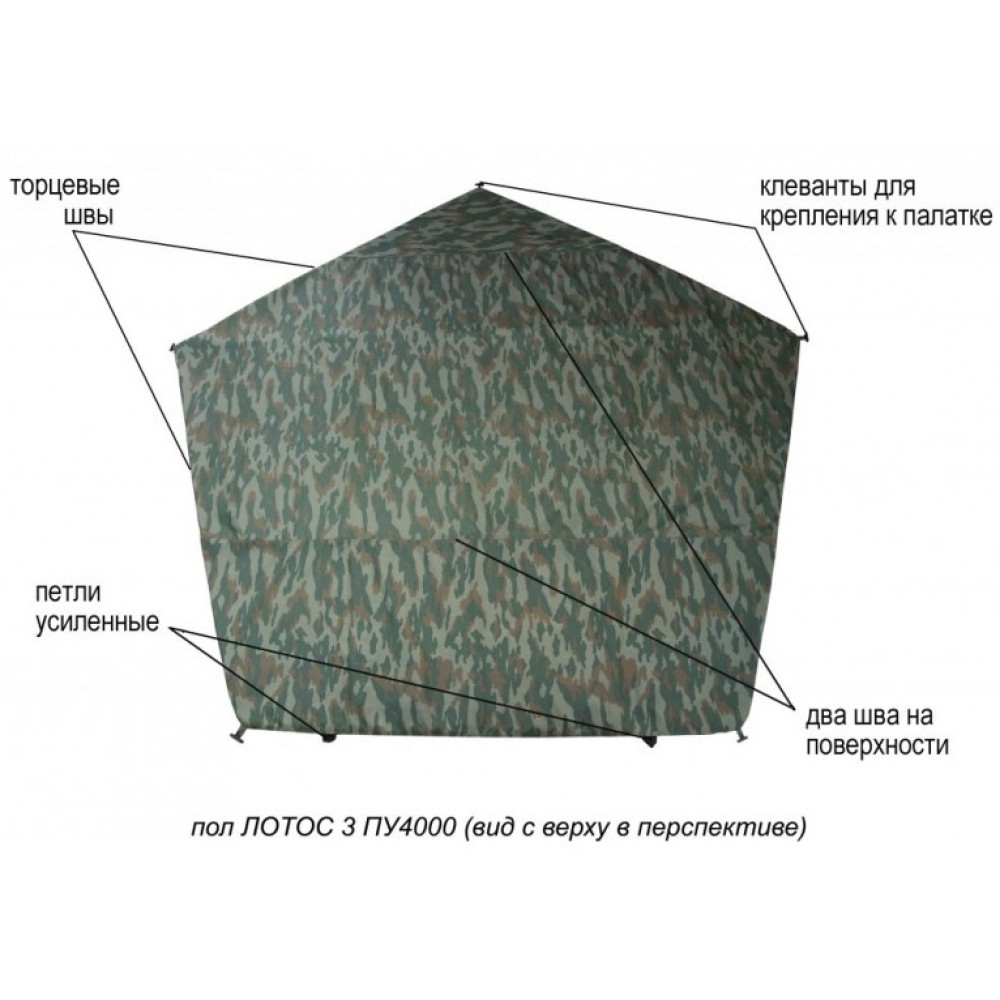 Предназначен для палаток собранных на стандартных каркасах «Лотос 3» и «Лотос 2». Имеет пятигранную форму и покрывает всю поверхность дна.