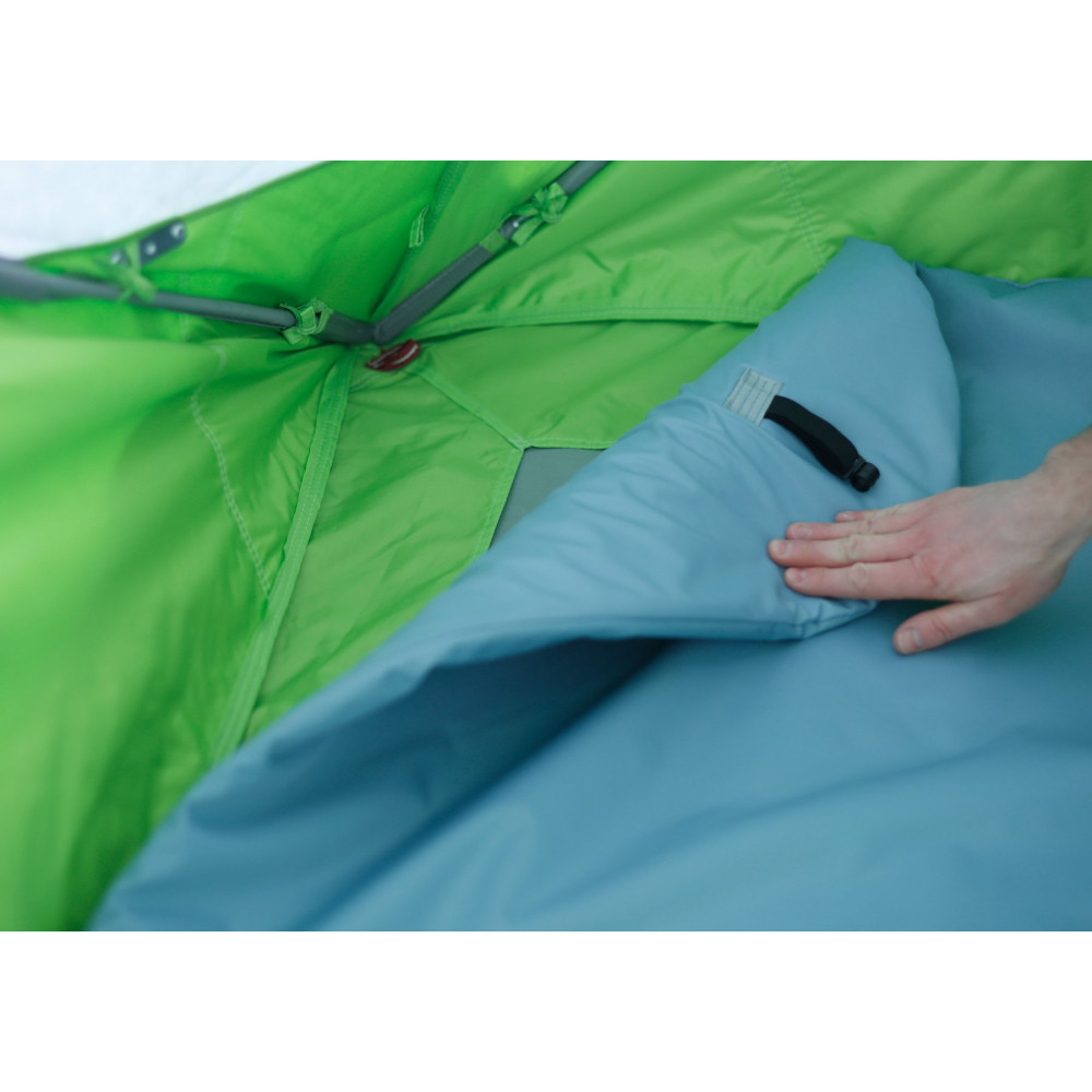 Утепленный пол крепится изнутри на крючках к специальным петлям, расположенным по углам на внутренней юбке палатки. Утепленный пол накрывает внутреннюю юбку палатки, предотвращая задувание ветра снизу.