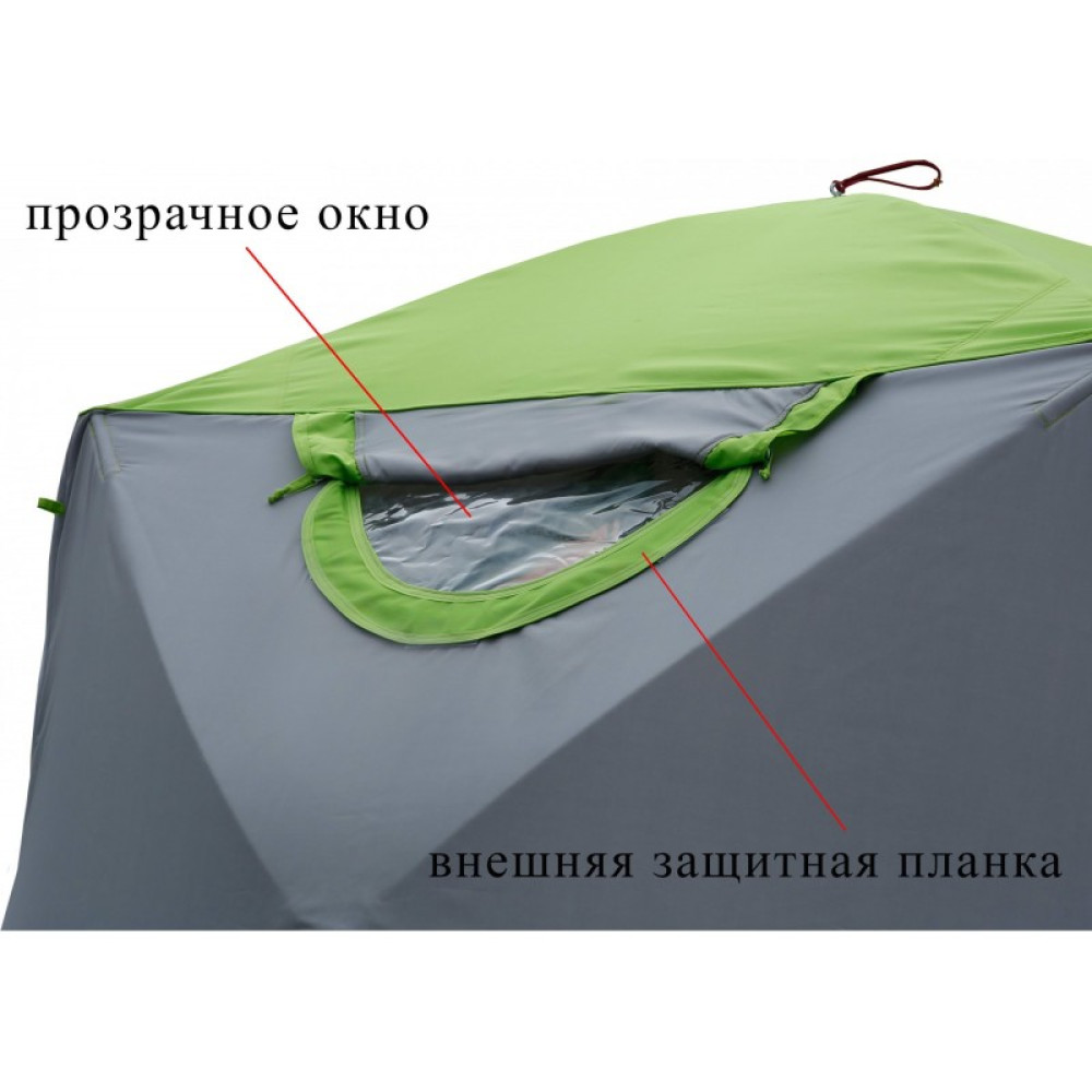 Прозрачное окно изготовлено из высокопрочной морозостойкой пленки толщиной 650 микрон, которая сохраняет эластичность при морозе до -40 °С. Сложение палатки и дальнейшая ее эксплуатация может производиться вместе с установленным на ней клапаном, но во избежание возможных повреждений прозрачного материала окна, его рекомендуется снимать при сложении палатки.