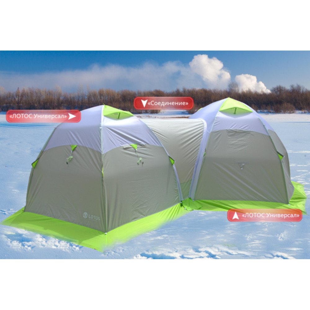 «Соединение 3/3» предназначено для присоединения между собой двух модульных палаток собранных на каркасе «Лотос 3», у которых имеется унифицированный D/образный вход. Оно крепиться к установленной (раскрытой) палатке при помощи специальной тракторной молнии. Соединение герметично крепиться к стенкам объединяемых палаток и хорошо защищает проход между палатками от осадков и ветра.