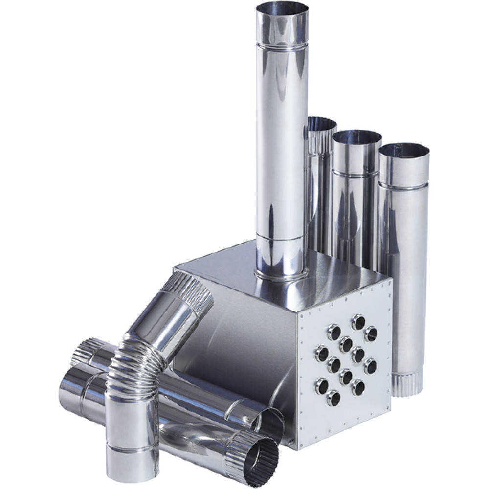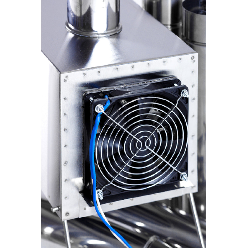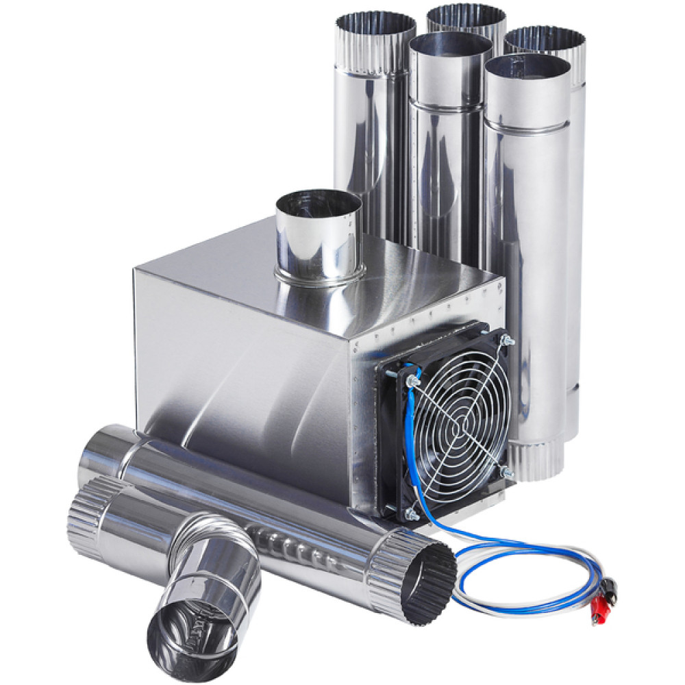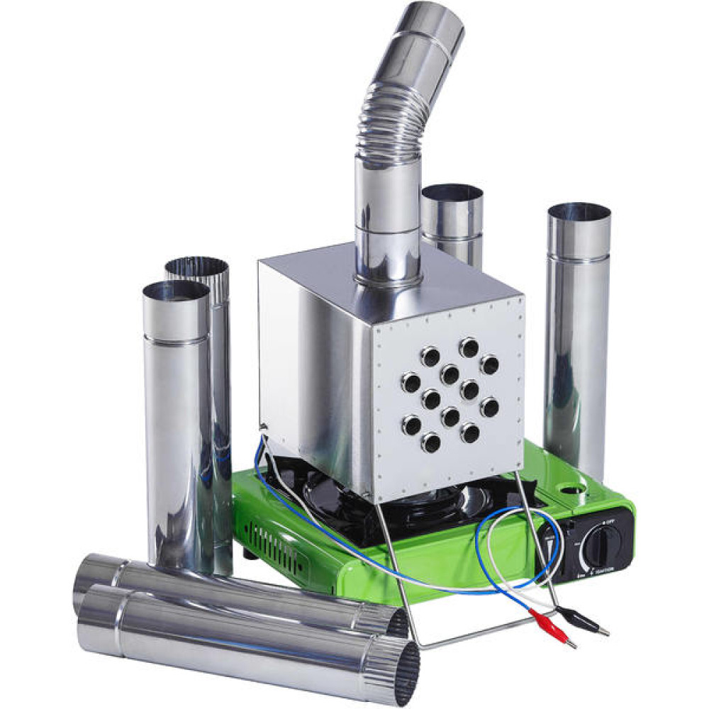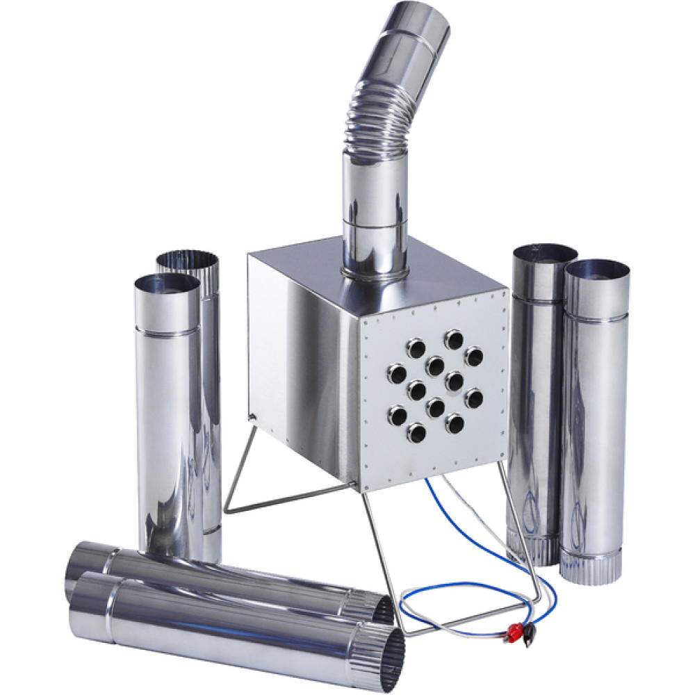 - Конструкция теплообменника состоит из металлического короба с проходящими сквозь него трубками с оснащенным выходом под дымоходную трубу, складных ножек и входного отверстия для размещения под ним газовой плитки или горелки, вентилятора (12 В).