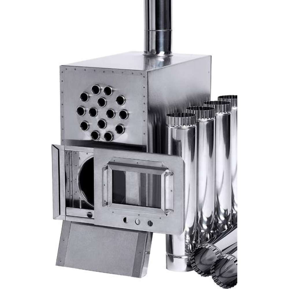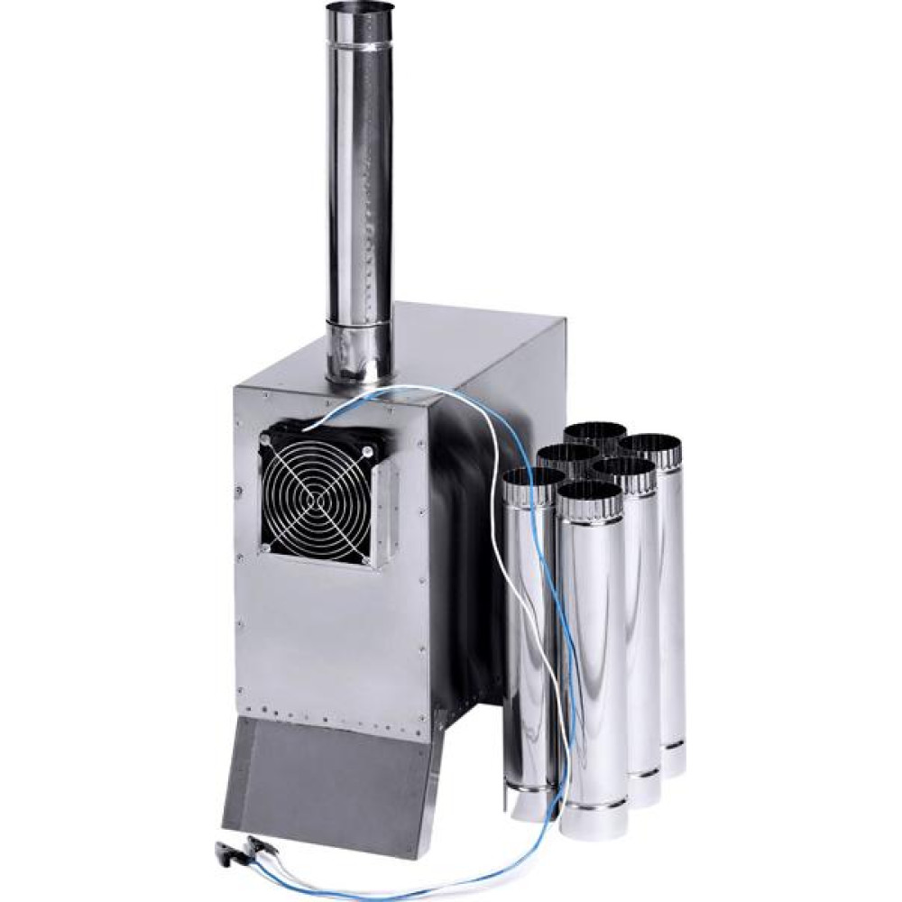 Теплообменник Вектор-ВД состоит из металлического короба с проходящими сквозь него трубками и оснащенным выходом под дымоходную трубу, складных ножек и быстросъёмного вентилятора.
