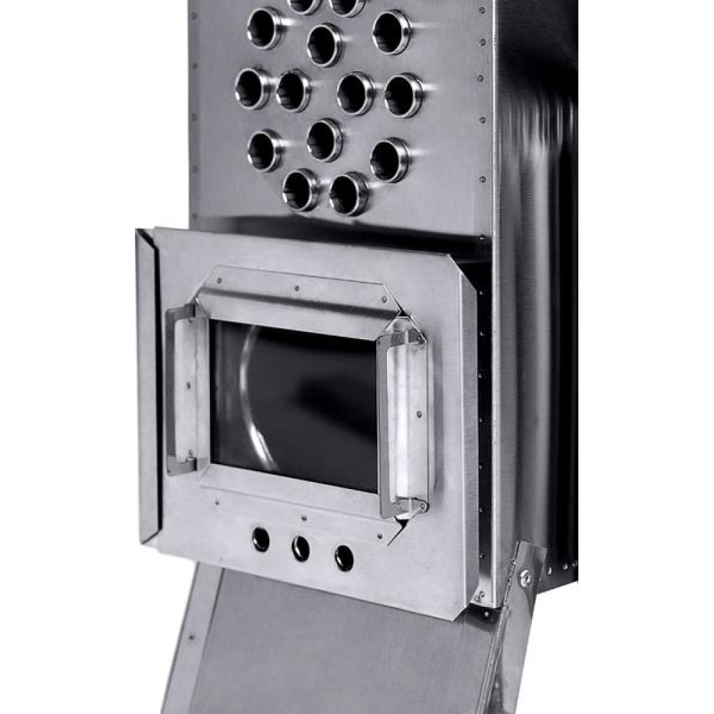 Топочное отверстие имеет дверцу с ручкой в виде слайдерной крышки с термостойким стеклом и отверстиями для регулировки тяги.